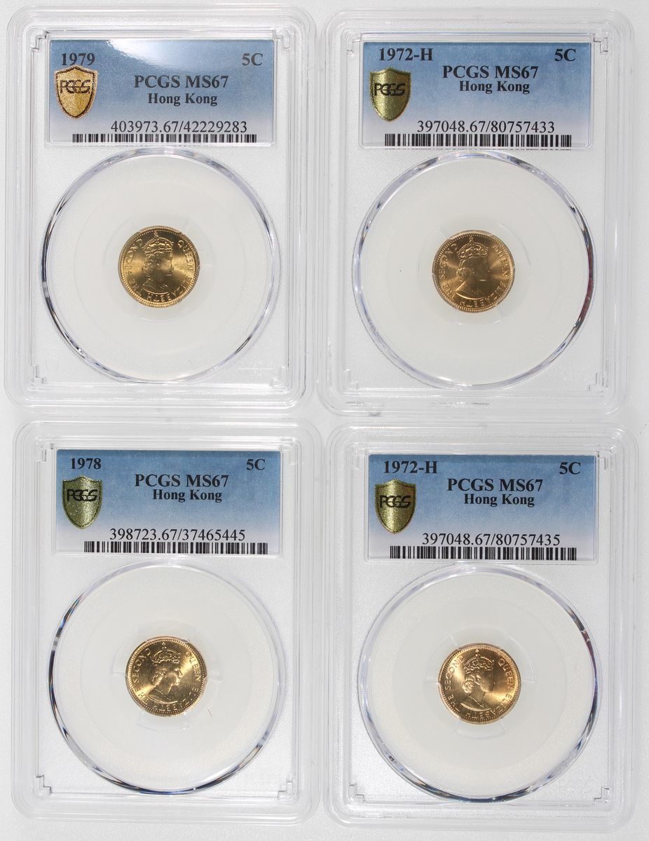 Hong Kong, [PCGS MS67] 5 cents (4), 1972H, 1978, 1979, all PCGS MS67. #80757433, #80757435, #37465445, #42229283 (4)