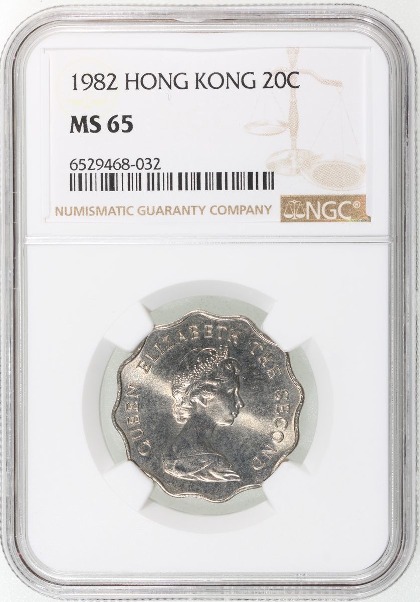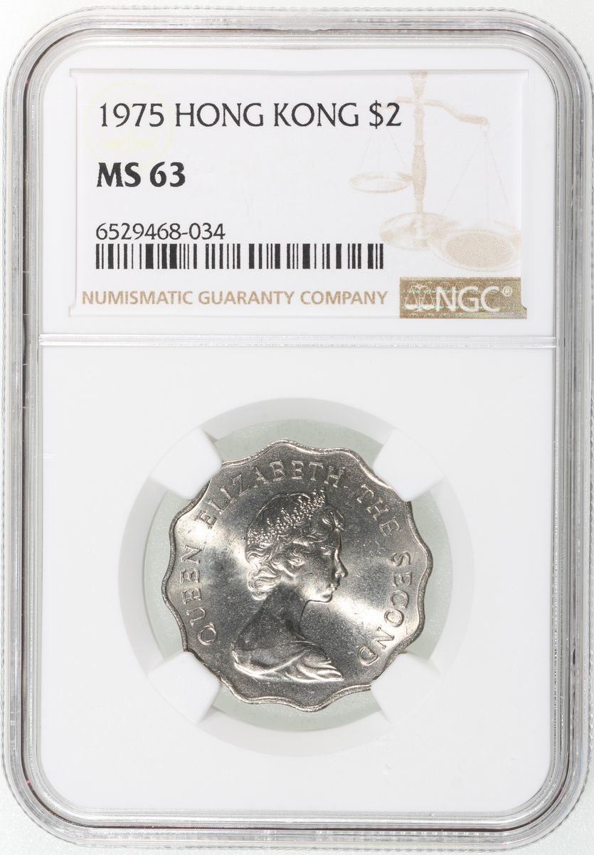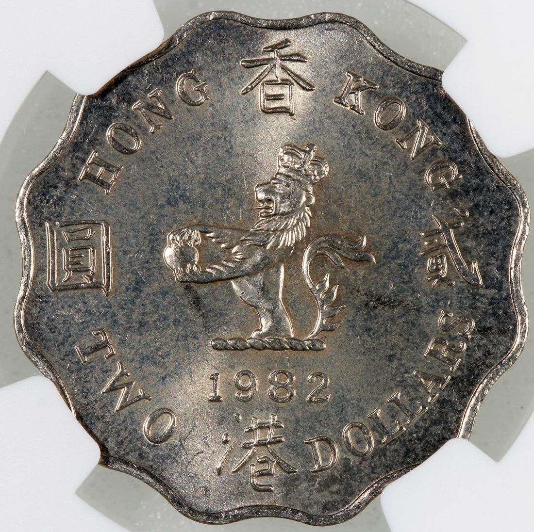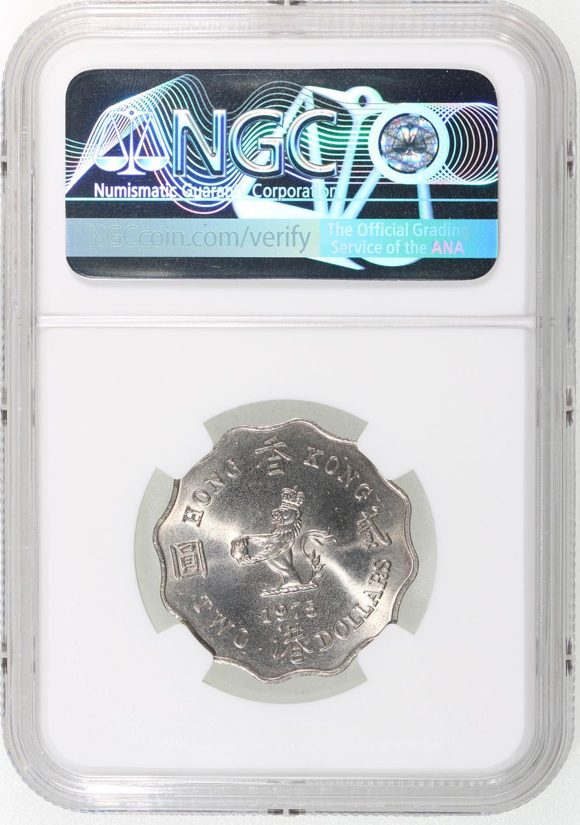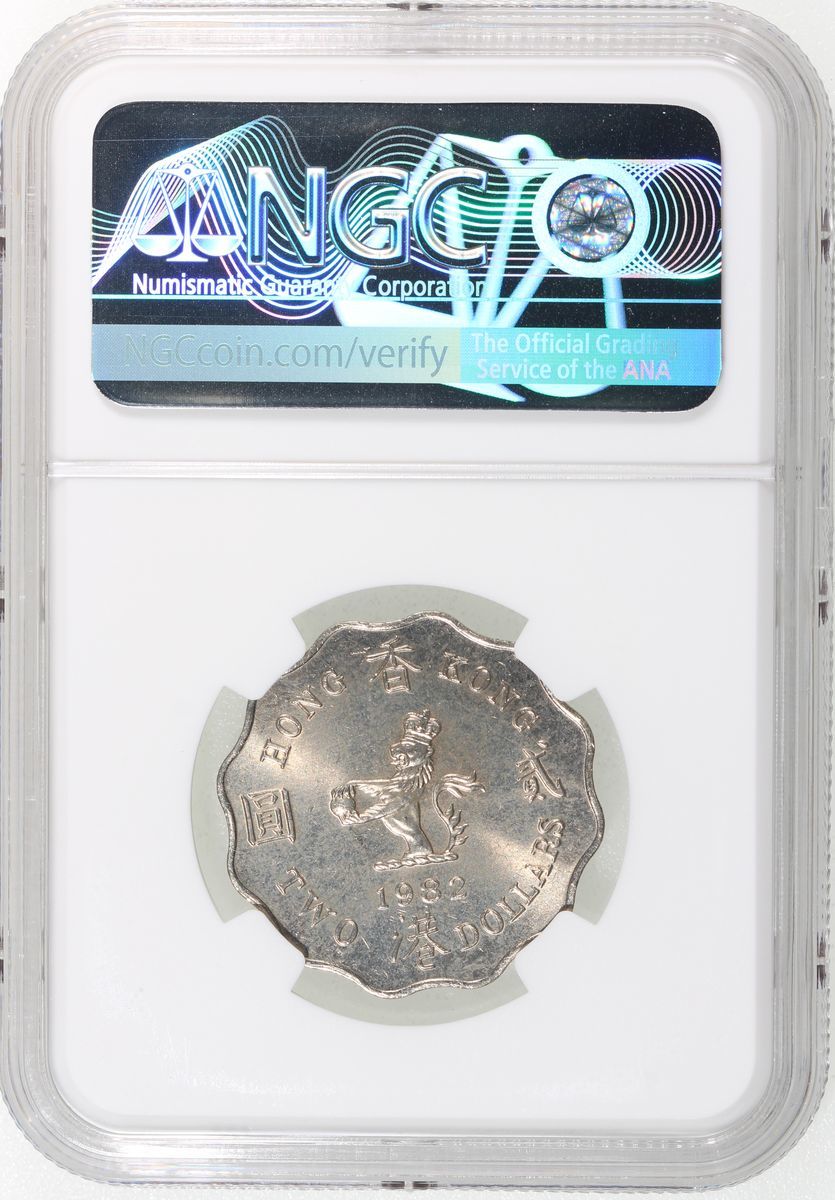 Hong Kong, a pair of $2, 1975, 1982, NGC MS63, cert. #6529468-034, MS65, cert. #629468-032