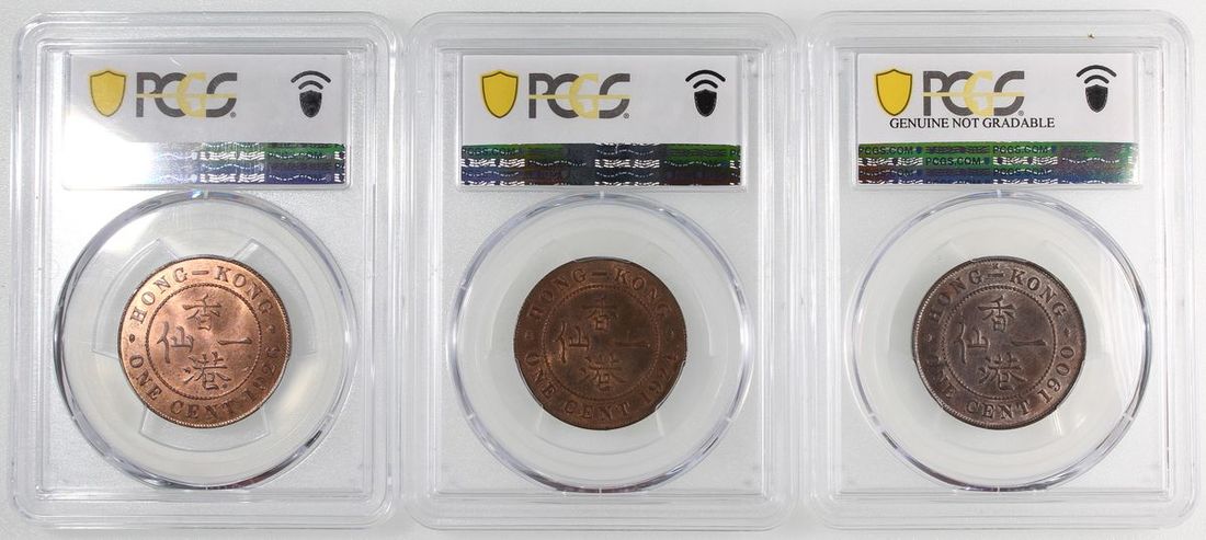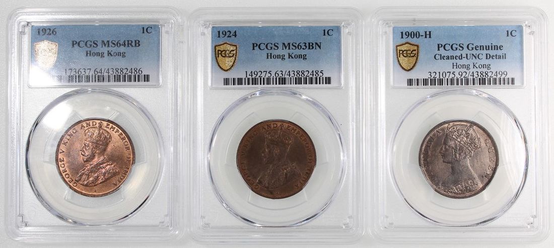 1900H、1924及1926年香港一仙一組3枚,PCGS分別評MS63BN、UNC Detail有清洗及MS64RB