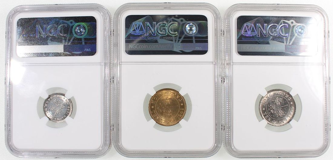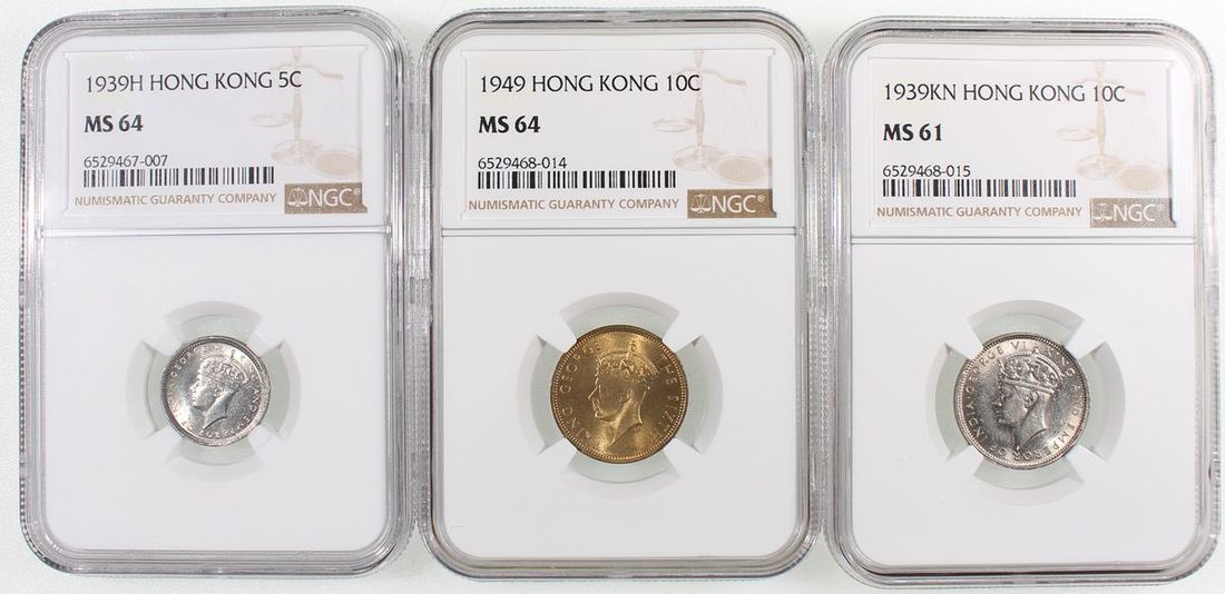 1939H、1939KN及1949年香港喬治六世五仙及一毫一組3枚,NGC分別評MS64、MS61及MS64