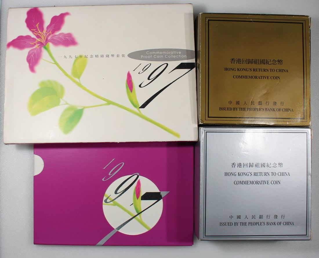 香港回歸紀念幣,包括1996及1997年中國人民銀行發行精鑄10元銀幣2枚,香港1997年精鑄套裝及未流通套裝(內含壹毫,貳毫、伍毫、壹圓、貳圓、伍圓及拾圓),全附原盒