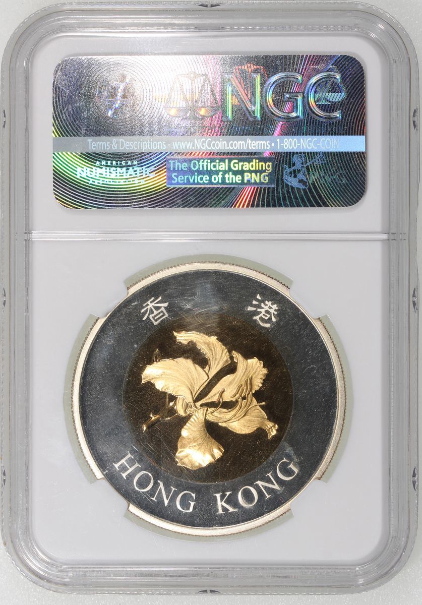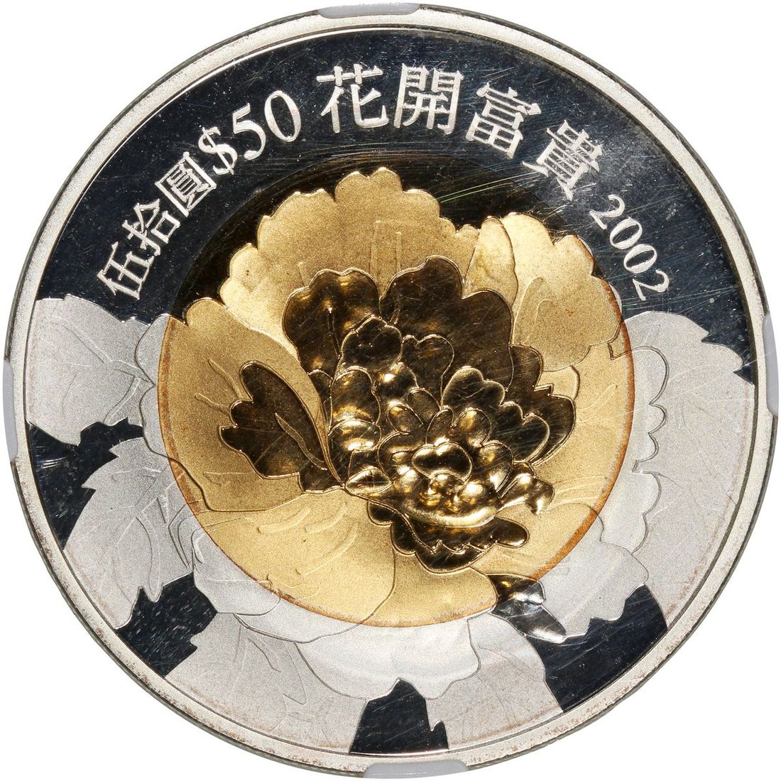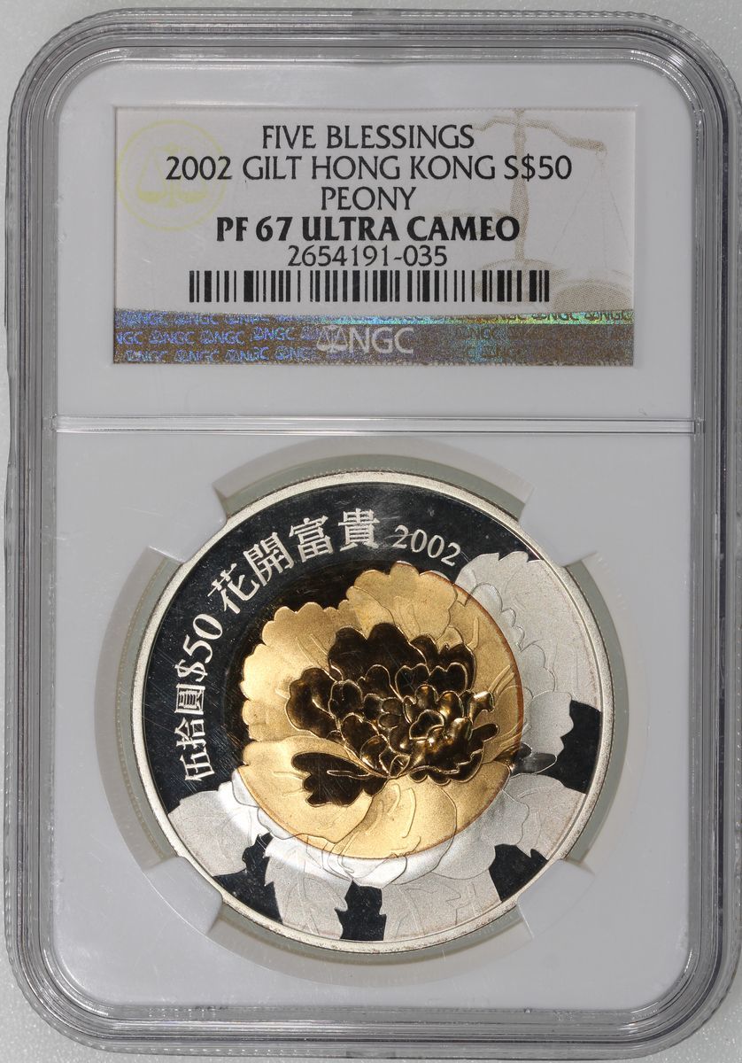 Hong Kong, [NGC PF67] silver $50 with gold plated centres, 2002, "Five Blessings" commemorative series, "Flowers Bloom for Prosperity",
