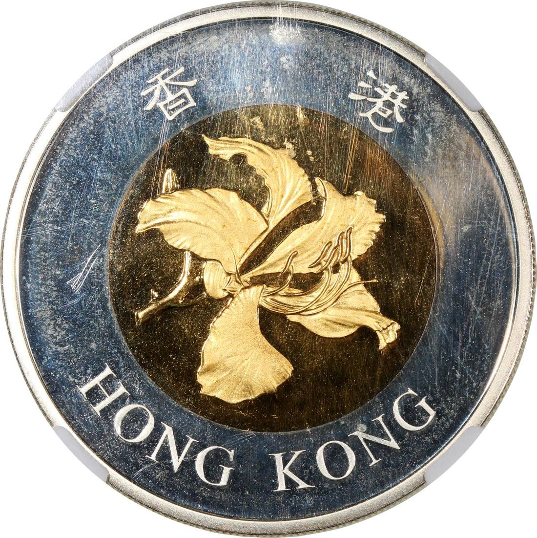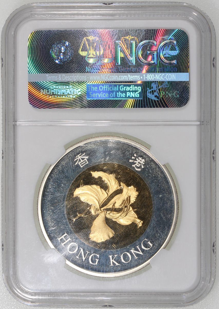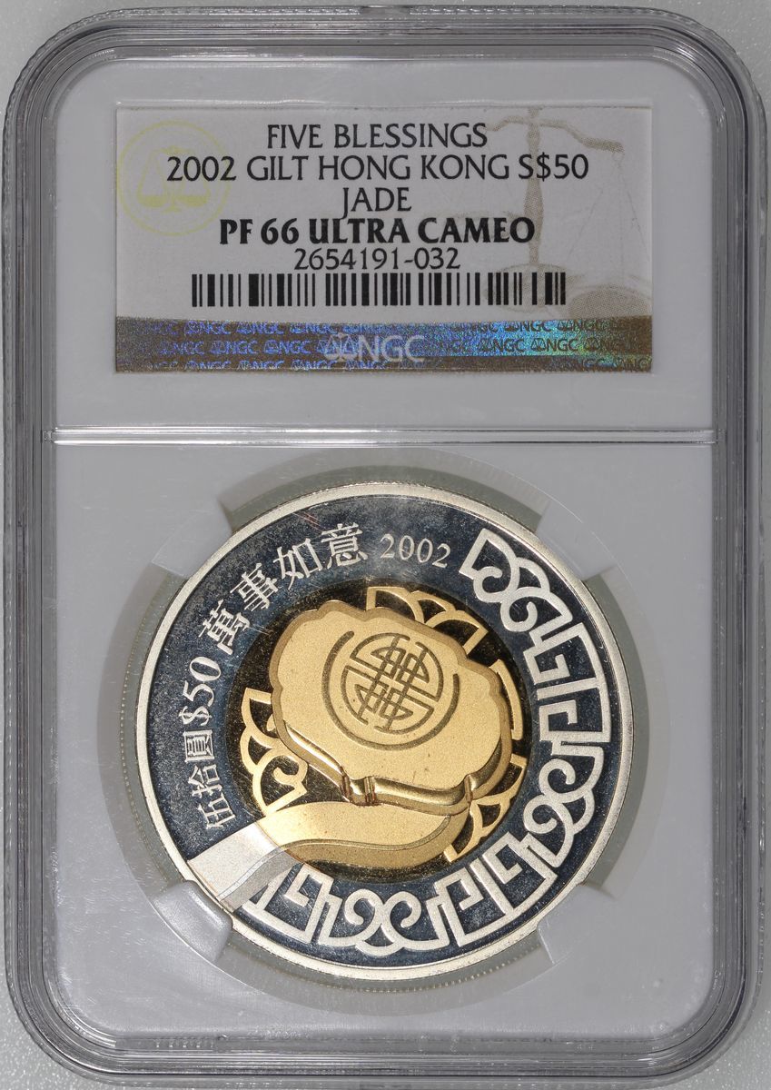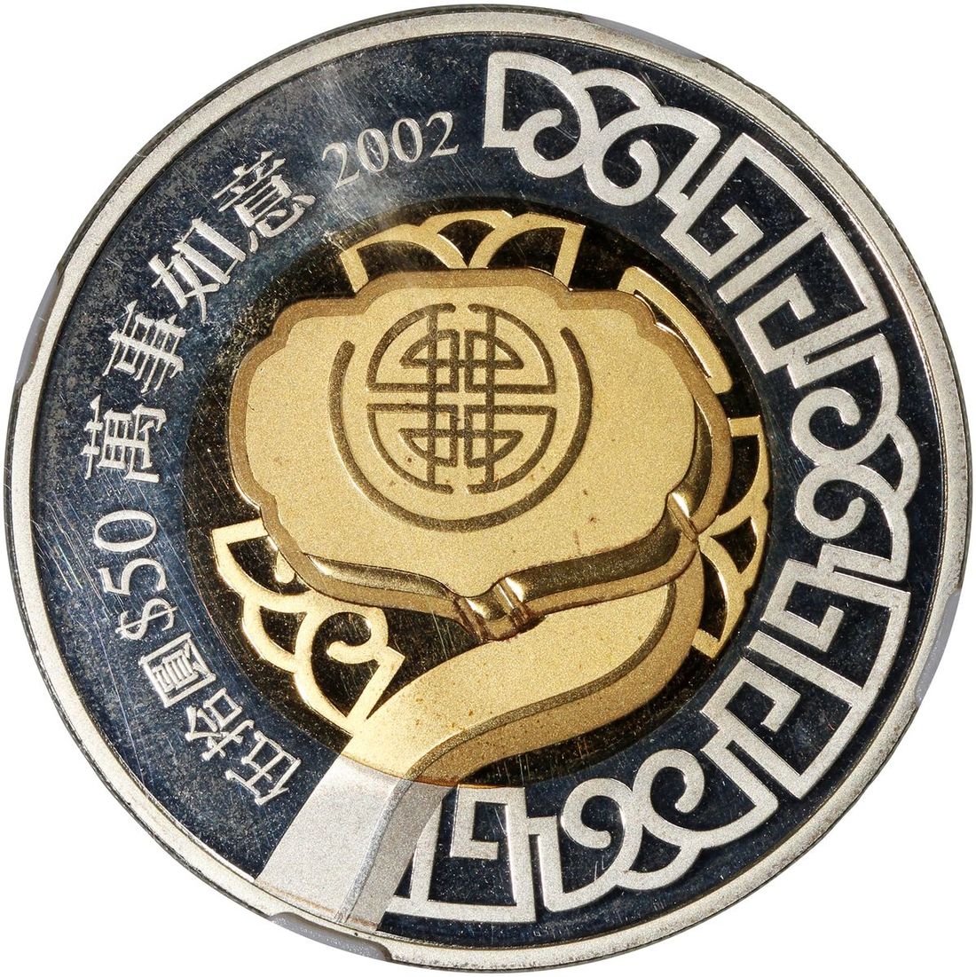 Hong Kong, [NGC PF66] silver $50 with gold plated centres, 2002, "Five Blessings" commemorative series, "May Your Wishes Come True",