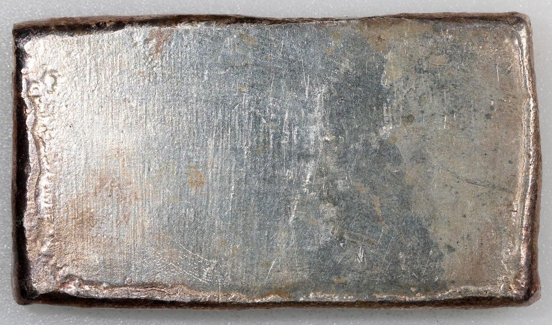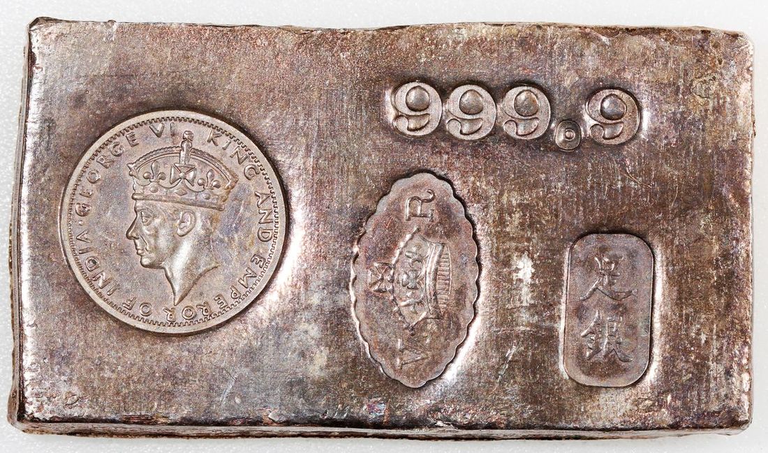 香港銀條,正面戳有喬治六世之頭像,該為仿香港維多利亞時代銀條之後製品,總含銀量4.4盎司,奪目彩虹包漿