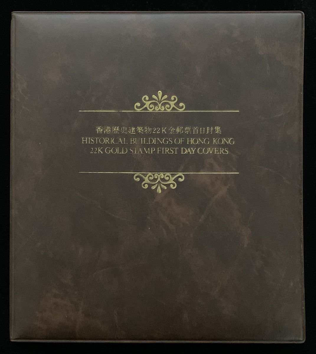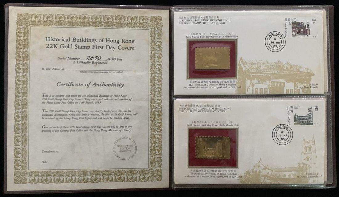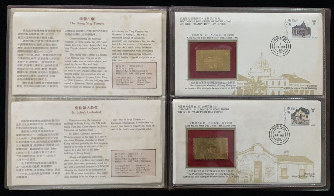 Hong Kong, 4x 22K Gold Stamp First Day Covers, 1985, Historical Buildings of Hong Kong, The Hung Sing Temple, St. John's Cathedral, The Old Supreme Court, The Wanchai Post Office, In original presentation folder and certificate of issue, set 2650 out of 8000, one is slightly torn (4)