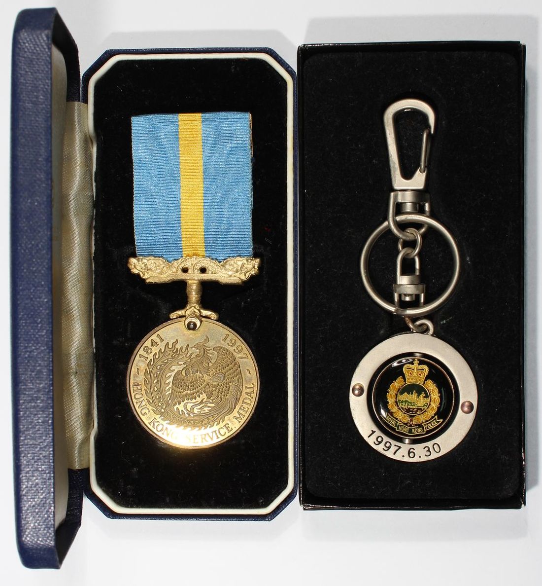 Hong Kong, Hong Kong Service Commemorative Medal, 1997, Bird of Paradise on obverse, Chinese characters 'Hong Kong' on reverse, blue ribbon with a golden yellow stripe at centre, medal suspender in the form of inter-twined dragons, awarded to former civil and military personnel of colonial Hong Kong; also included a Royal Hong Kong Police keychain, 1997; medal Uncirculated, polychromatic toning on reverse (2)