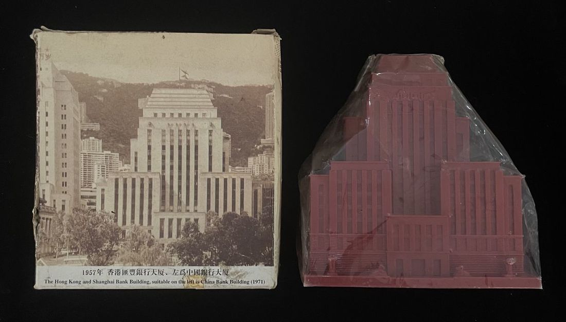 The Hongkong and Shanghai Banking Corporation, Hong Kong, a red plastic money bank in the shape of the old HSBC headquarters, in the orginal paper box, part of the collective memory of the generation