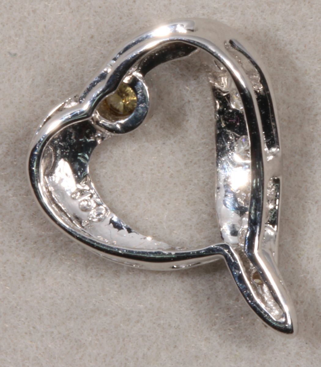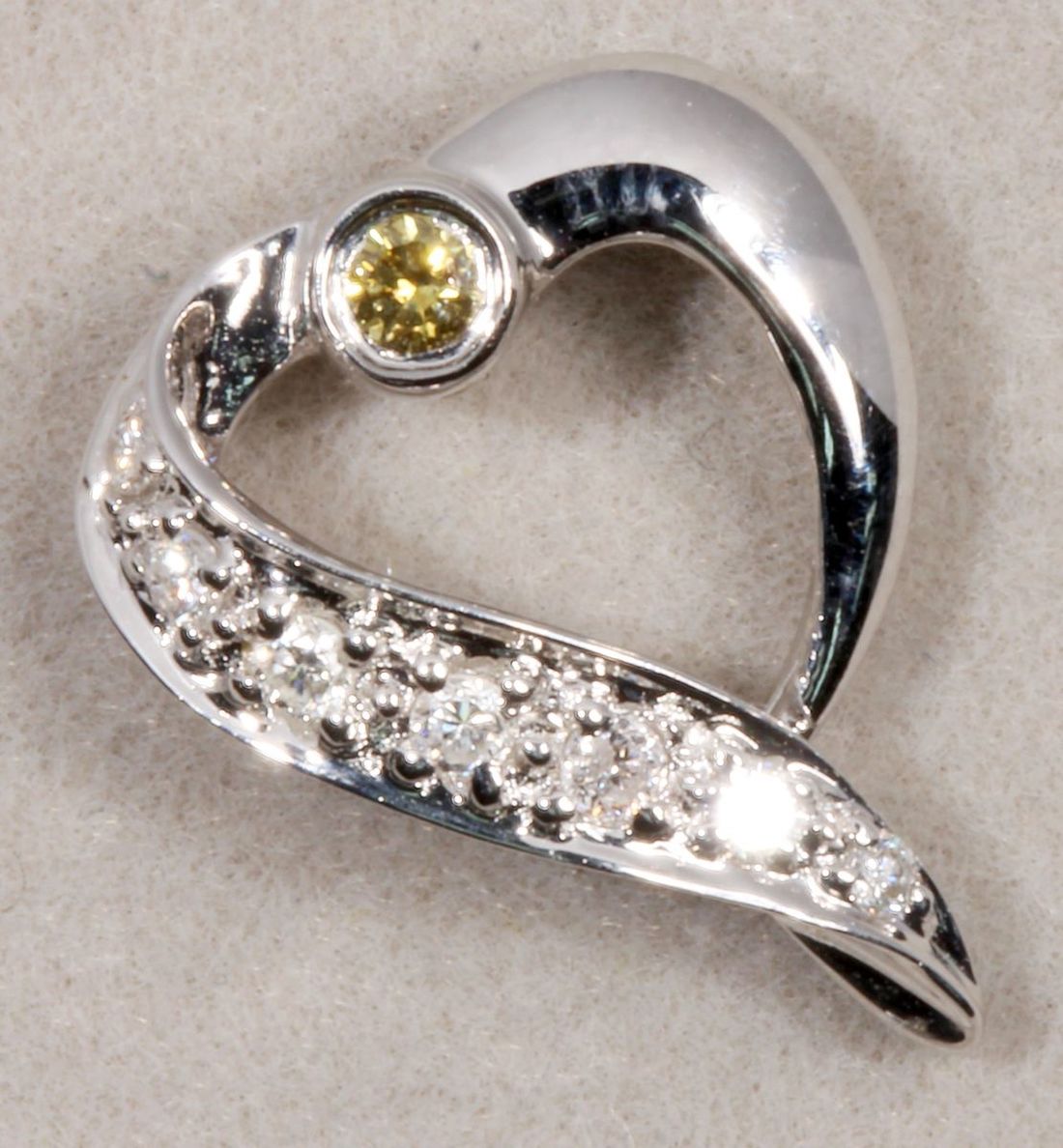 (x) An 18k white gold diamond pendant, weighs 1.22g, 7 diamonds 0.09 carats in total, and 1 yellow diamond 0.04 carats