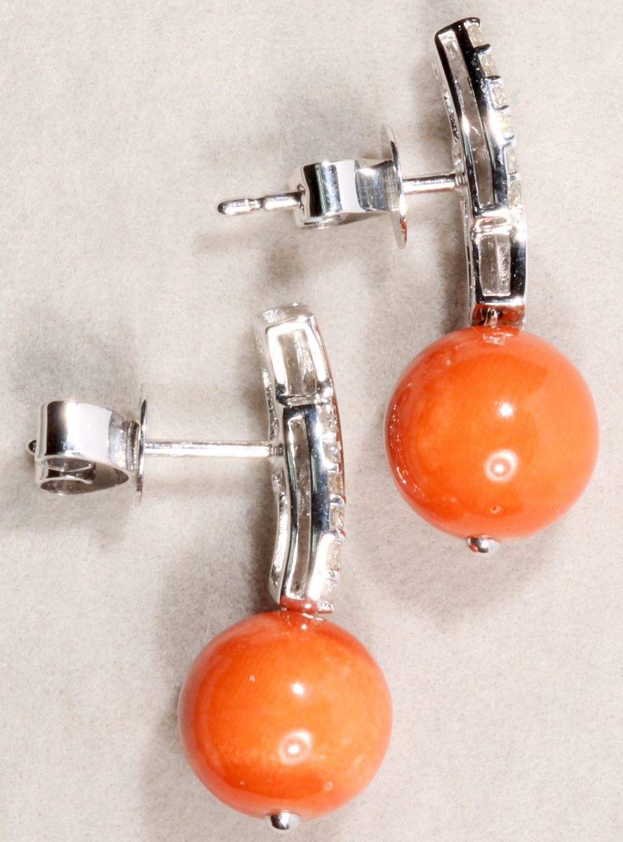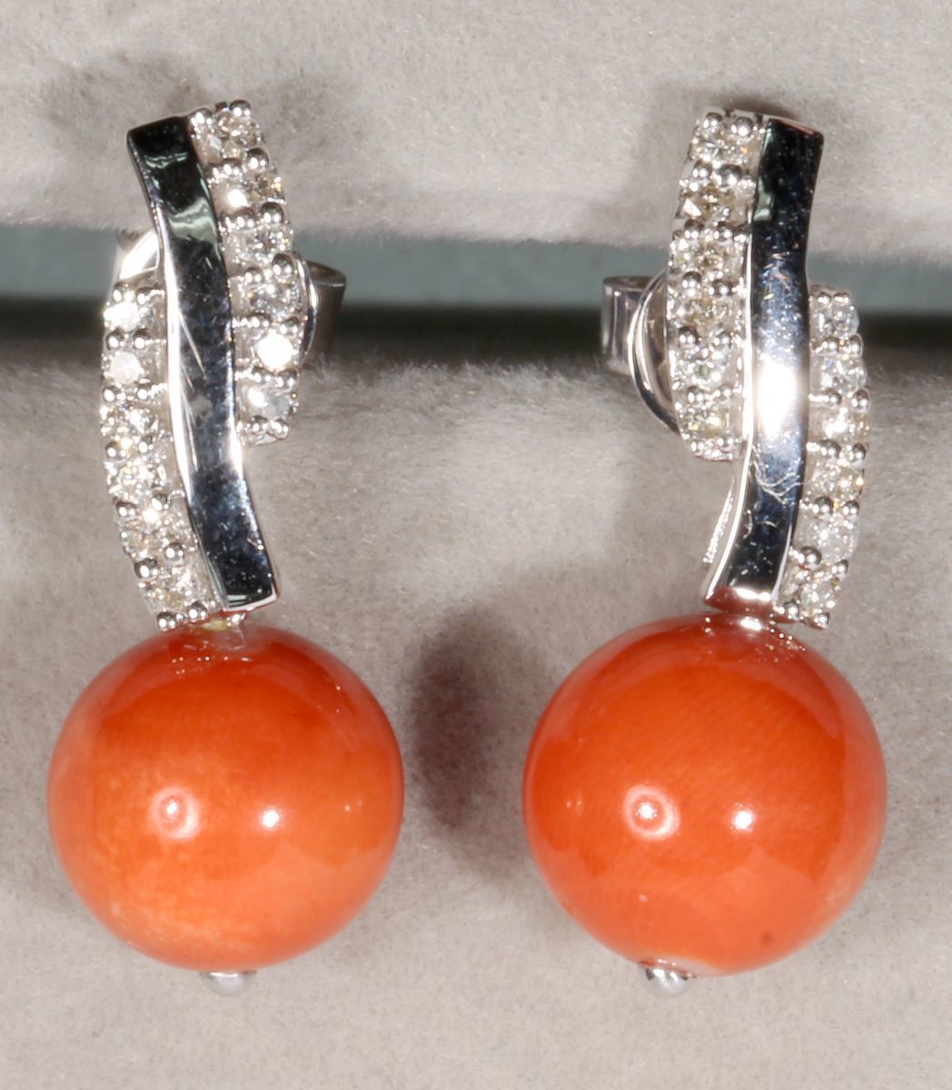 18K白金紅珊瑚鑽石耳環一對,重2.71克,24枚鑽石,共0.26卡