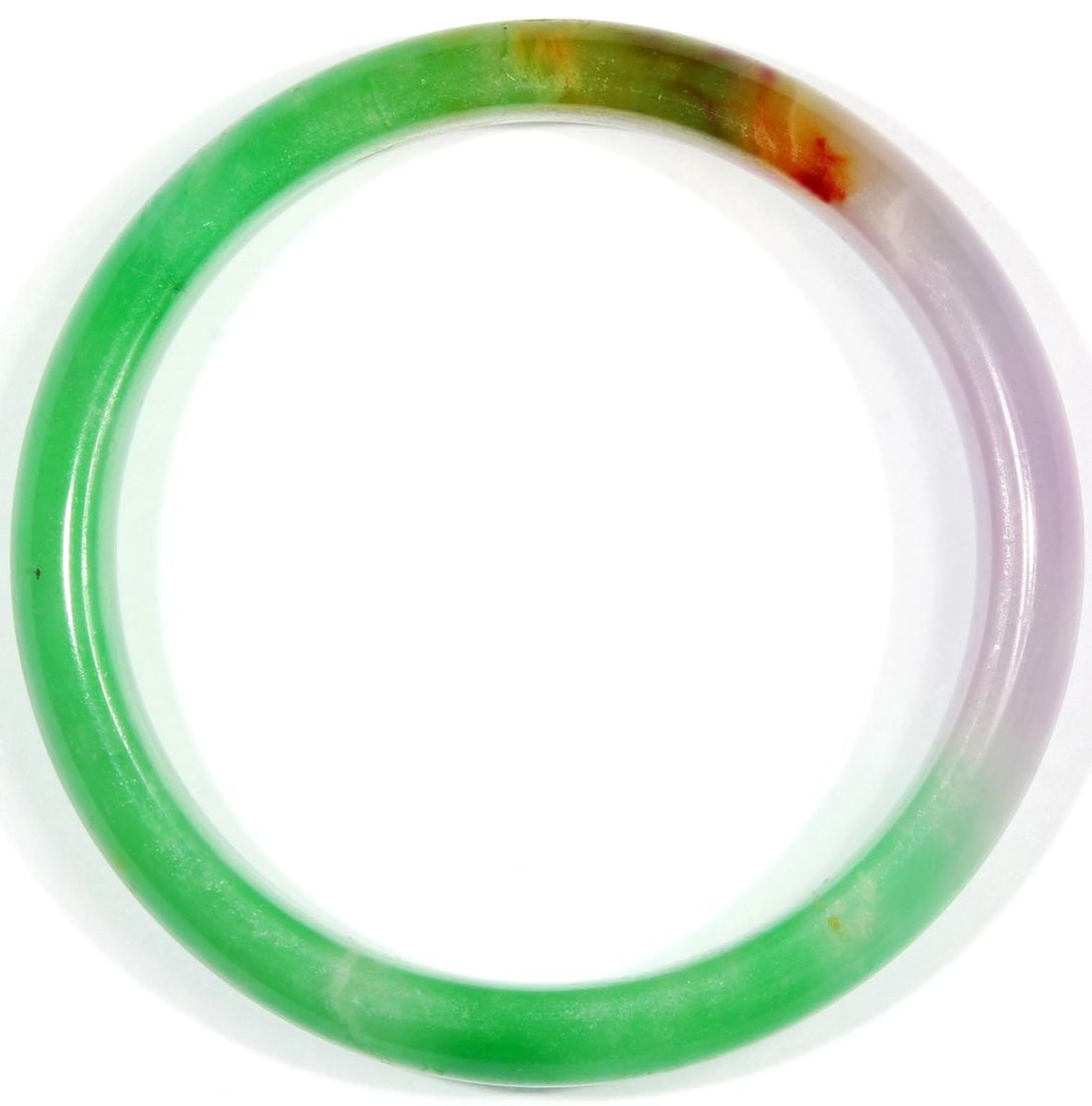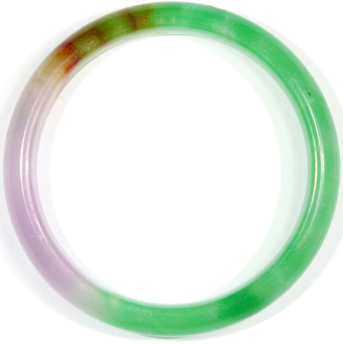 (x) A tri-colour jadite bangle, in lilac, green and brown, signifiying the Chinese characters 'Fu' (Fortune), 'Lu' (Prosperity) and 'Shou' (Longevity), measures 73.36 x 59.03 x 12.88mm