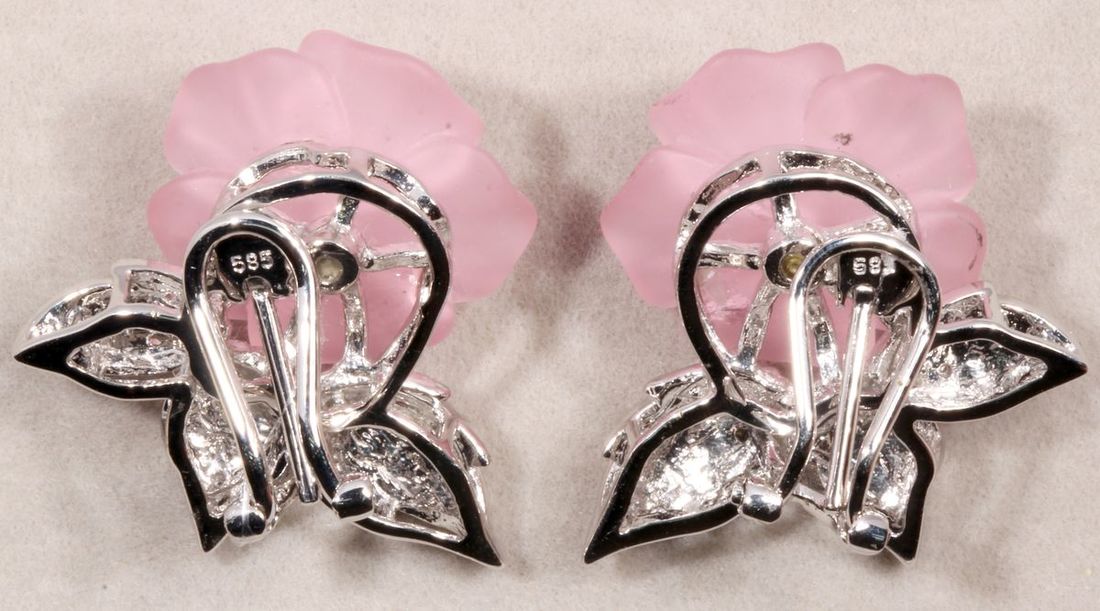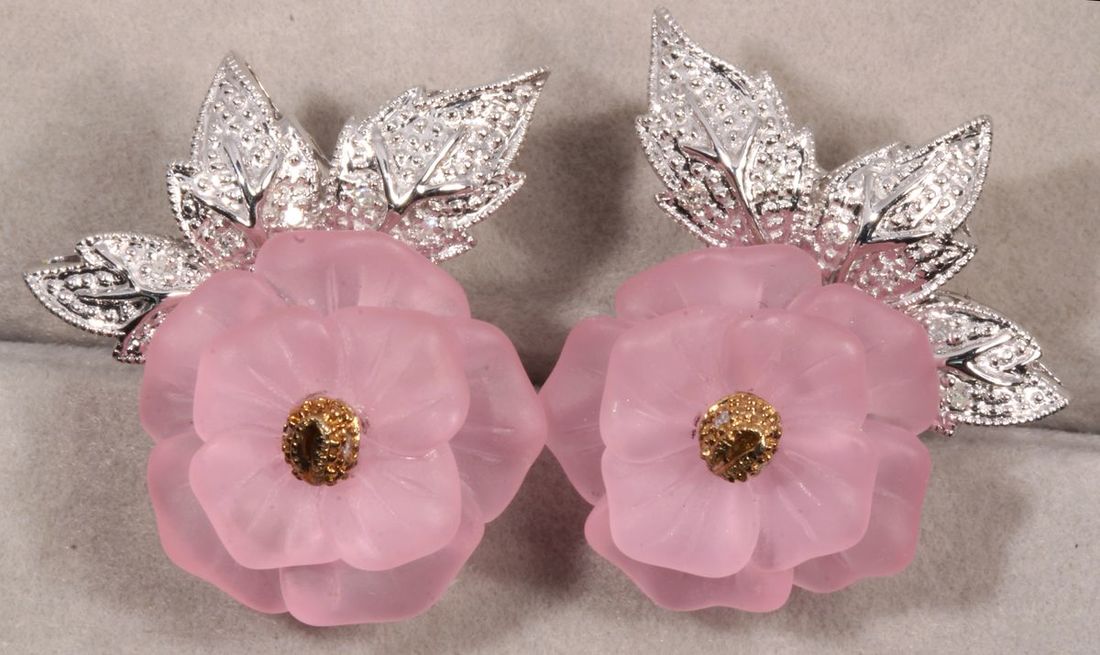 (x) A pair of 14k white gold diamond floral earrings, pink petals, weighs 11.02g, 16 diamonds 0.09 carats in total