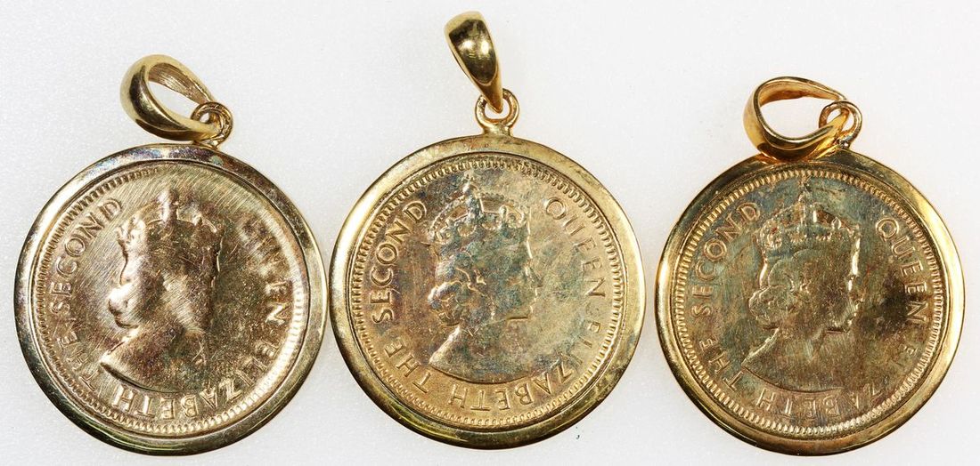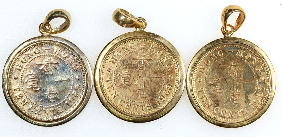 Hong Kong, a group of 3x 10 Cents (3), 1959, 1967, 1968, all mounted as jewellery (3)