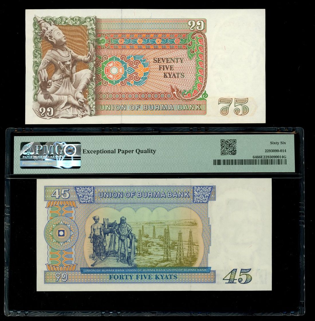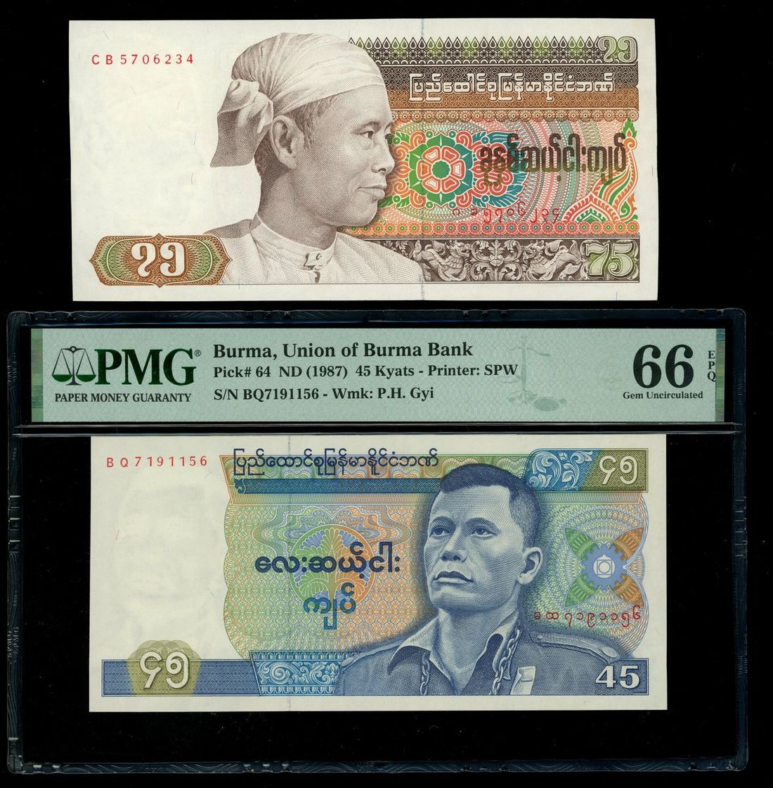 Union of Burma Bank, a pair, including 45 and 75 kyats, ND (1985-87), (Pick 65), PMG 66EPQ and aUNC respectively (2)