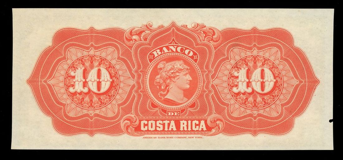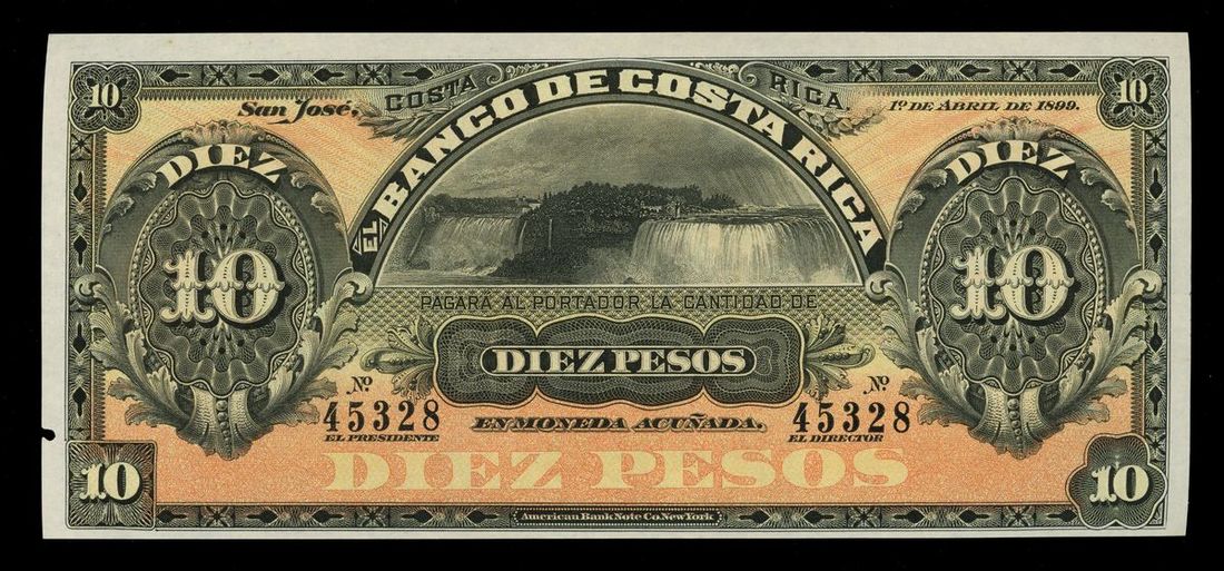Banco de Costa Rica, remainder 10 pesos, 1899, serial number 45328, (Pick S164r), small hole at left margin, otherwise uncirculated