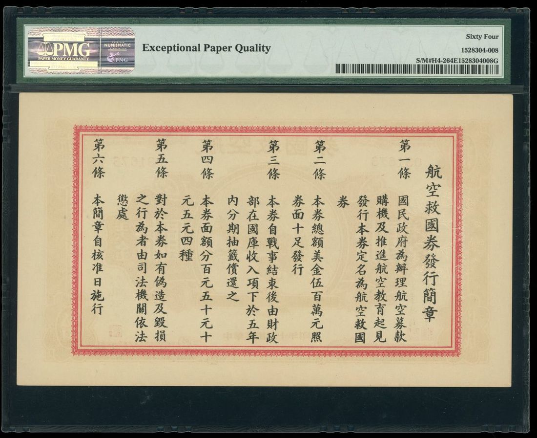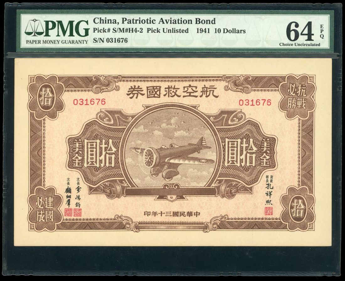 China Patriotic Aviation Bond, $10, Year 30 (1941), serial number 031676, brown, airplane at centre,