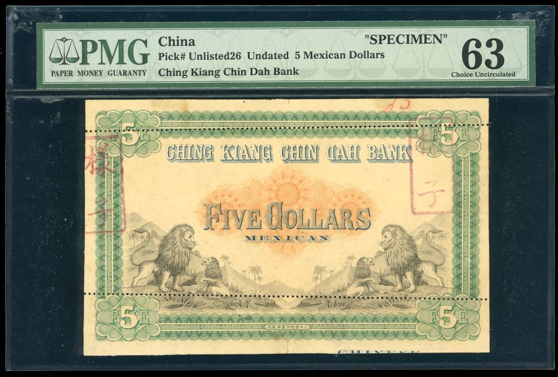 Ching Kiang Chin Dah Bank墨西哥鷹洋伍圓單面樣票,PMG 63,私營銀行鈔,銀行中文名稱無從稽考,設計題材獨特兼華麗,罕見