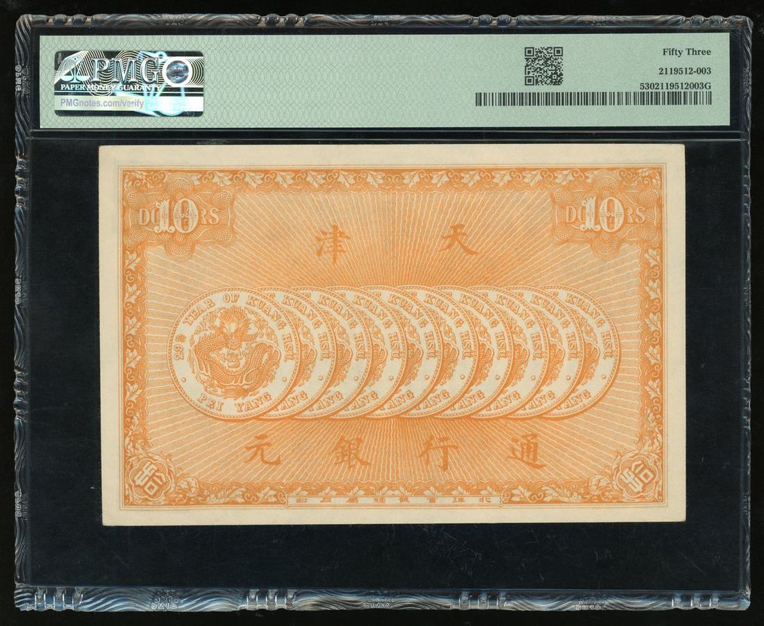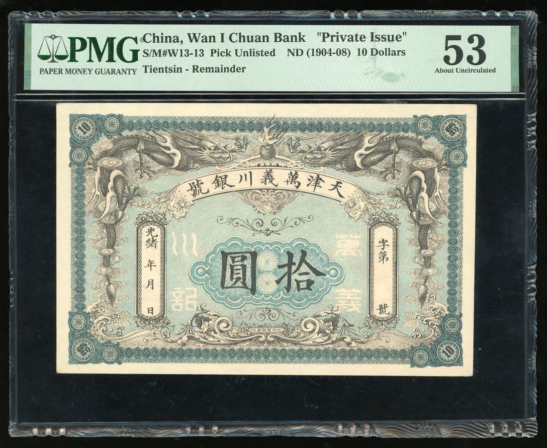 Wan Yi Chuan Bank, Private Issue, China, remainder $10, ND (1904-1908), Tientsin, no serial number, blue and black, dragons top centre, reverse orange, printed by the Peiyang Official Gazette,