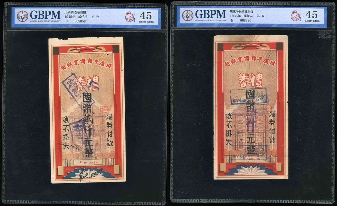 Chuan Kang People's Commercial Bank, China, a pair of gift vouchers, including 2000 and 4000 yuan, 1935/45, both in GBPM holder 45 (2)