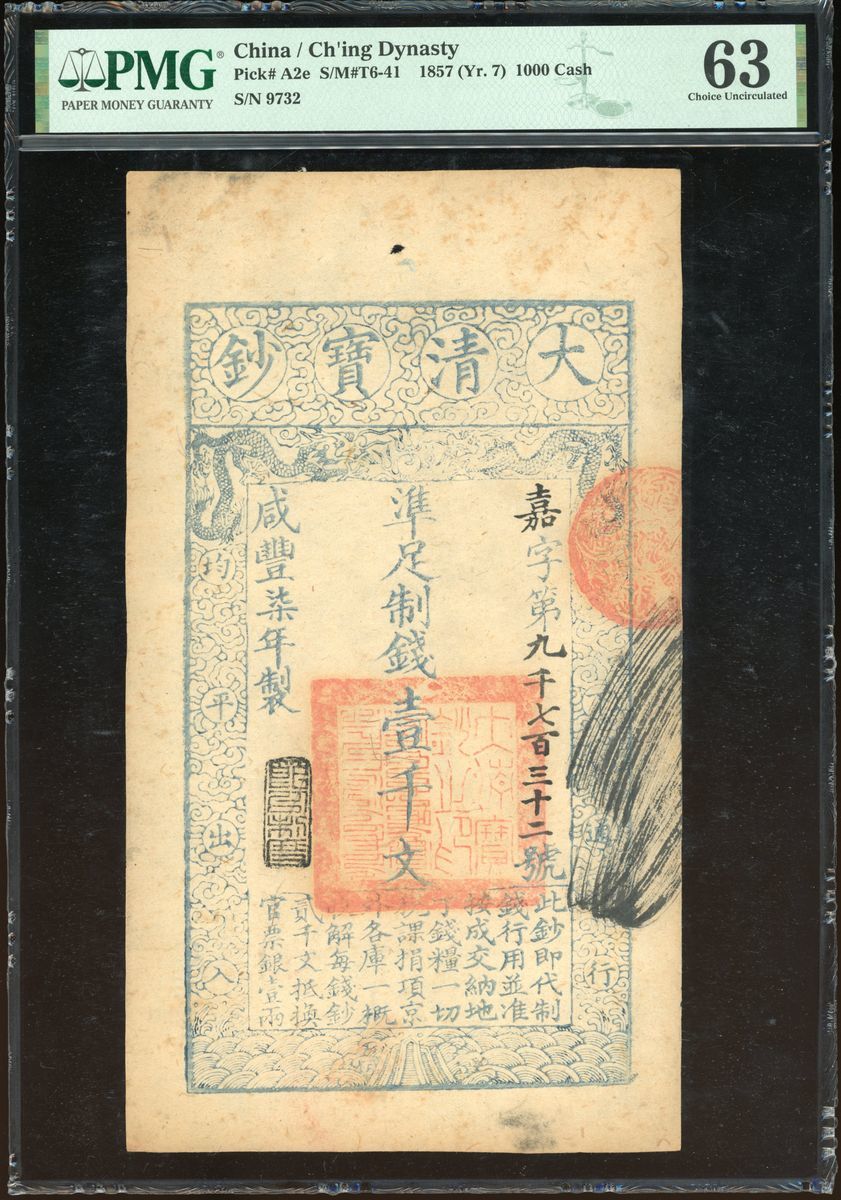 China, Qing Dynasty, Da Qing Bao Chao, 1000 cash, Year 7 (1857), serial number 9732, (Pick A2e), PMG 63, spindle hole at issue, minor stains
