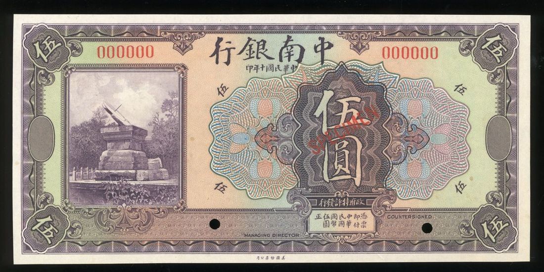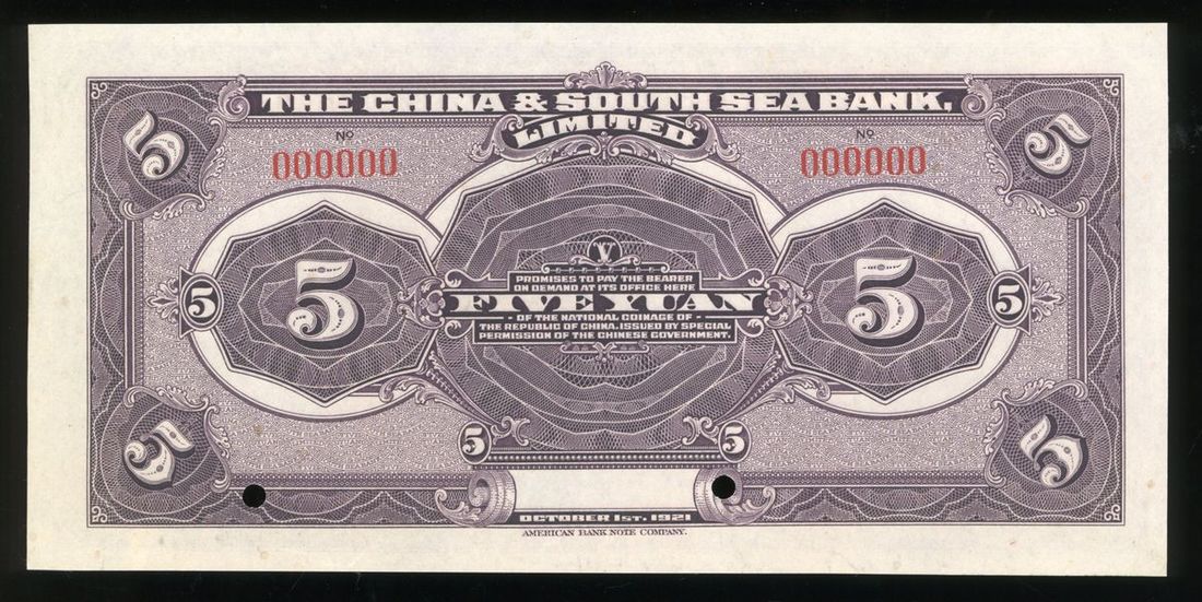 The China & South Sea Bank, SPECIMEN 5 yuan, 1921, serial number 000000, (Pick A122s), uncirculated