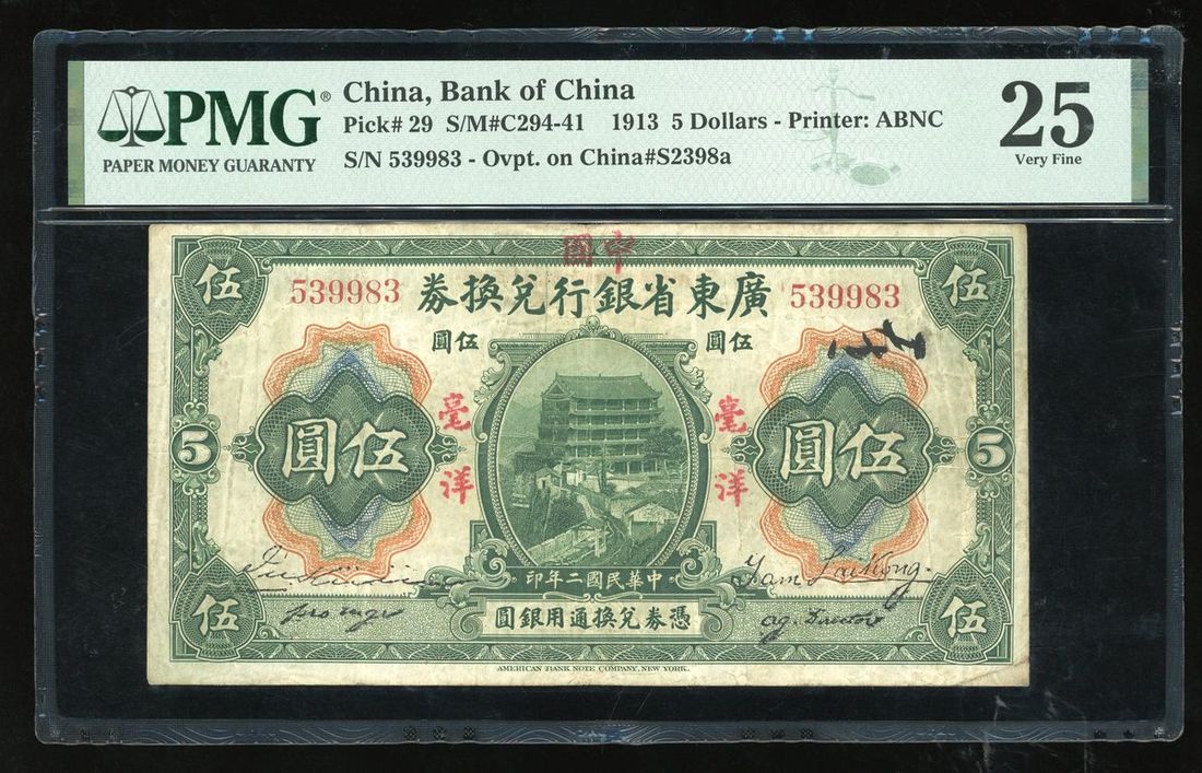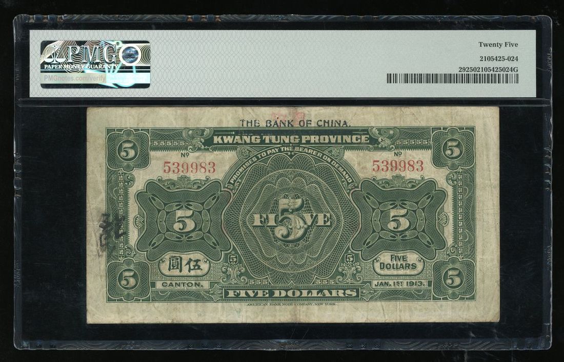 Bank of China, 5 yuan overprinted on Provincial Bank of Kwangtung note, 1913, serial number 539983, (Pick 29), PMG 25.