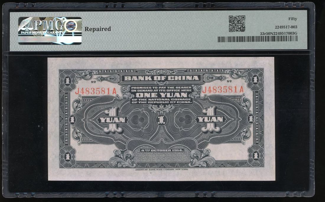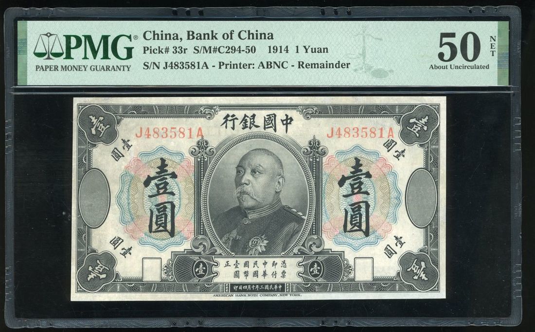 民國三年中國銀行壹圓庫存票,袁世凱像,編號J 483581 A,未正式發行,PMG 50NET,有修補,極罕低面額版式