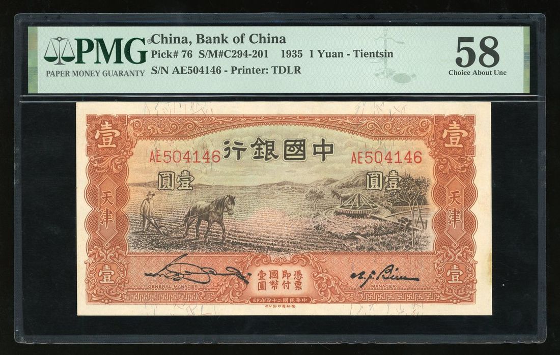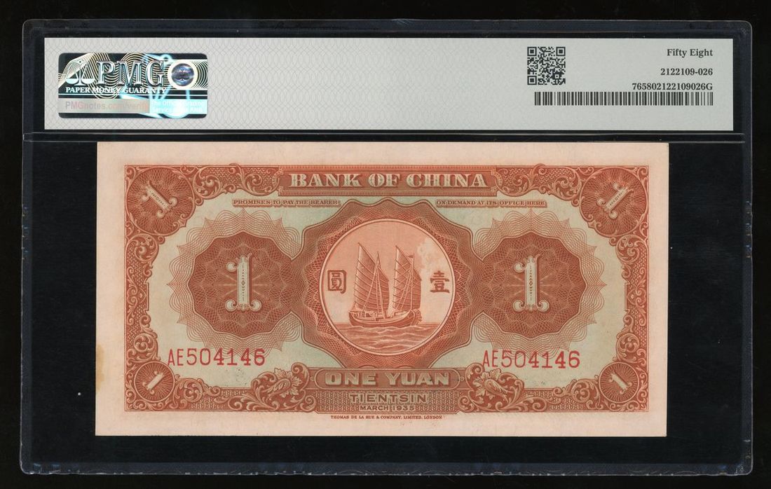 Bank of China, 1 yuan, 1935, Tientsin, serial number AE 504146, (Pick 76), PMG 58 Choice About Uncirculated