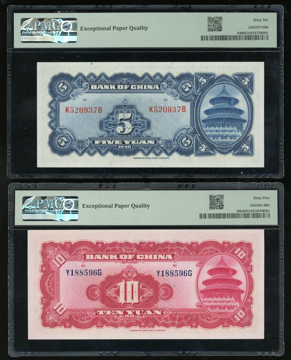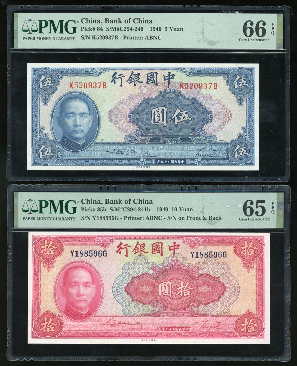 Bank of China, a pair, 1940, including 5 and 10 yuan, (Pick 84, 65b), PMG 66EPQ, 65EPQ respectively (2)
