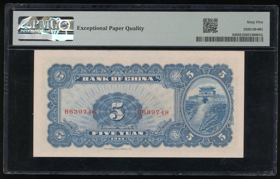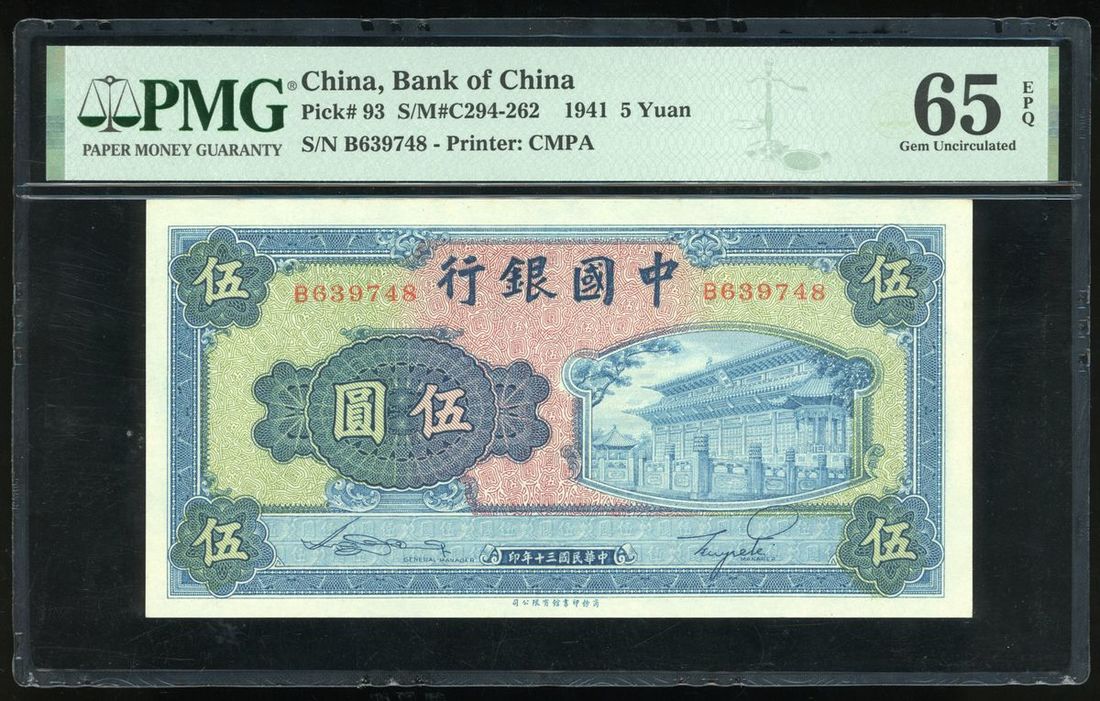 Bank of China, 5 yuan, Year 31 (1941), serial number B 639748, (Pick 93), PMG 65EPQ Gem Uncirculated. Scarce high grade example