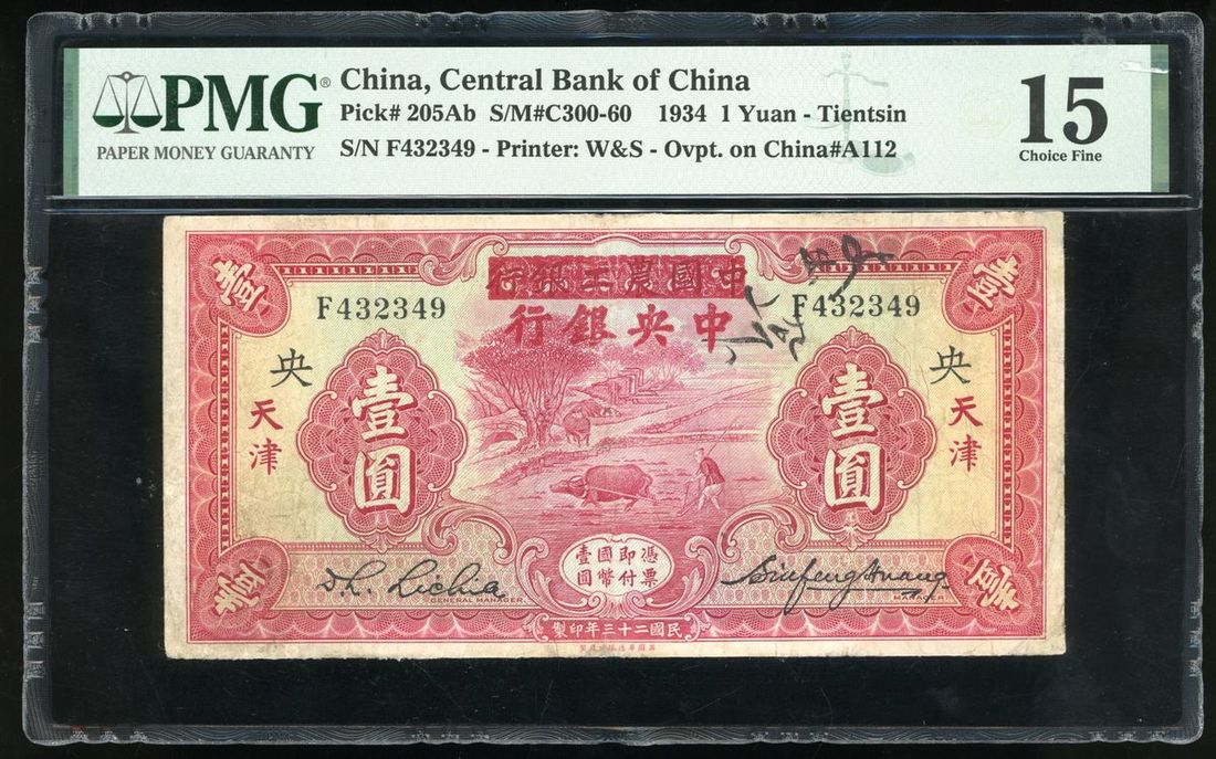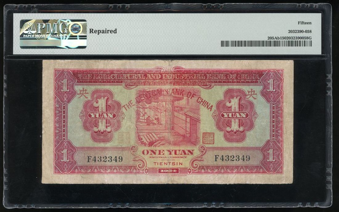 Central Bank of China, 1 yuan overprinted on Agricultural and Industrial Bank of China, 1934, serial number F432349, (Pick 205Ab), PMG 15, repaired.