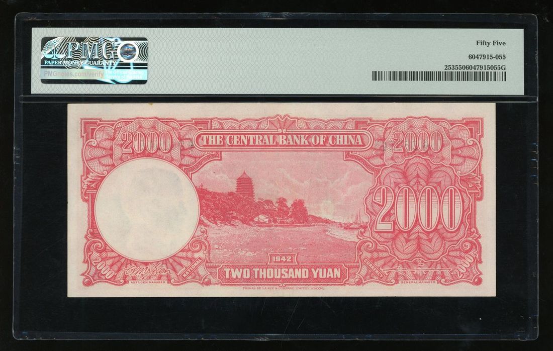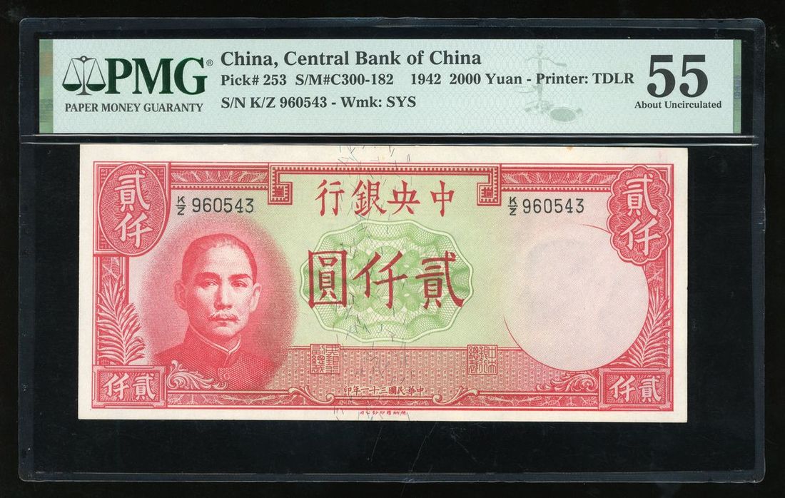 Central Bank of China, 2000 yuan, 1942, serial number K/Z 960543, (Pick 253), PMG 55 About Uncirculated