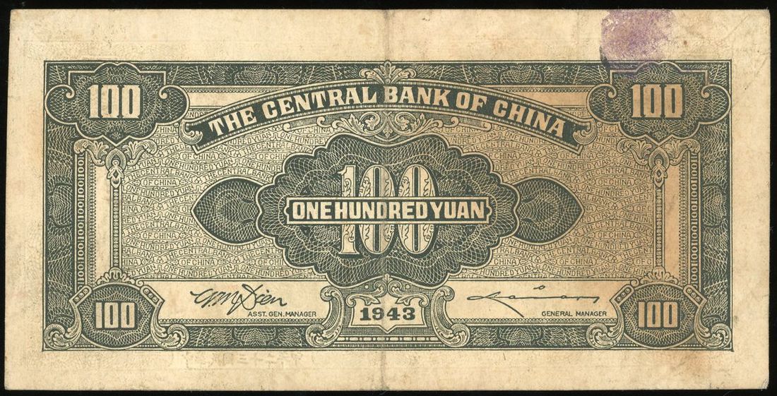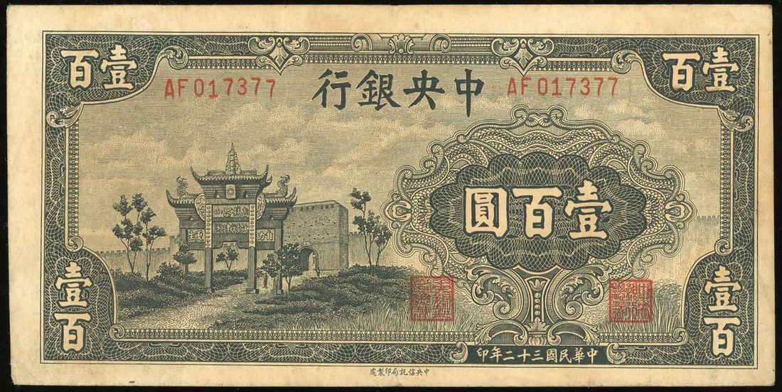 Central Bank of China, 100 yuan, Year 32 (1943), serial number AF017377, (Pick 254), very fine