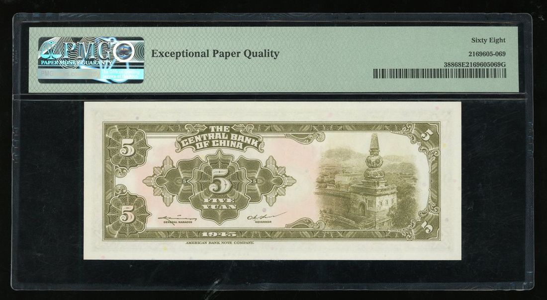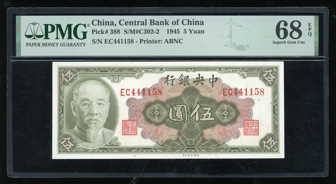 Central Bank of China, 5 yuan, 1945, serial number EC441158, (Pick 388), PMG 68EPQ superb gem unc. TOP POP on PMG census!