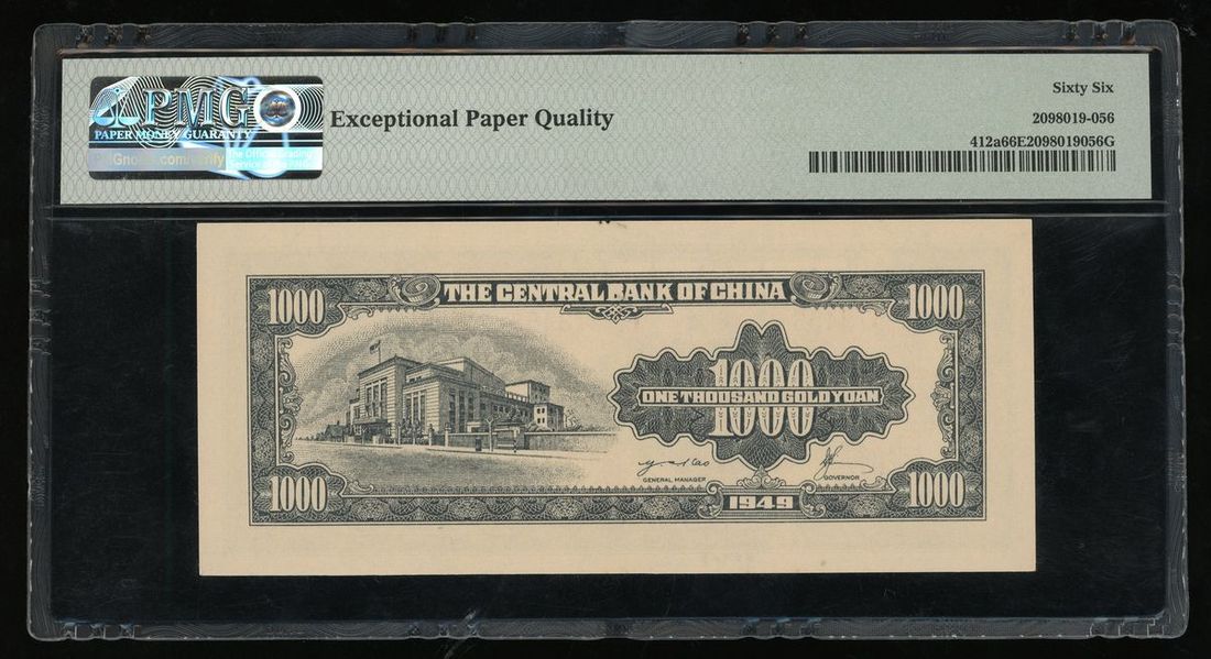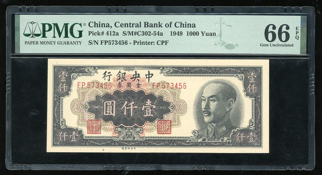 Central Bank of China, 1000 yuan, 1949, serial number FP573456, (Pick 412a), PMG 66EPQ gem uncirculated