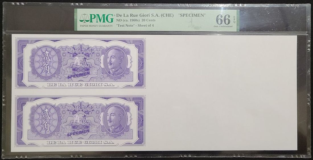 De La Rue Giori S.A. China, a sheet of 4x 20 cents, ca.1960s, all designs engraved, 2 in purple, 2 without colours,