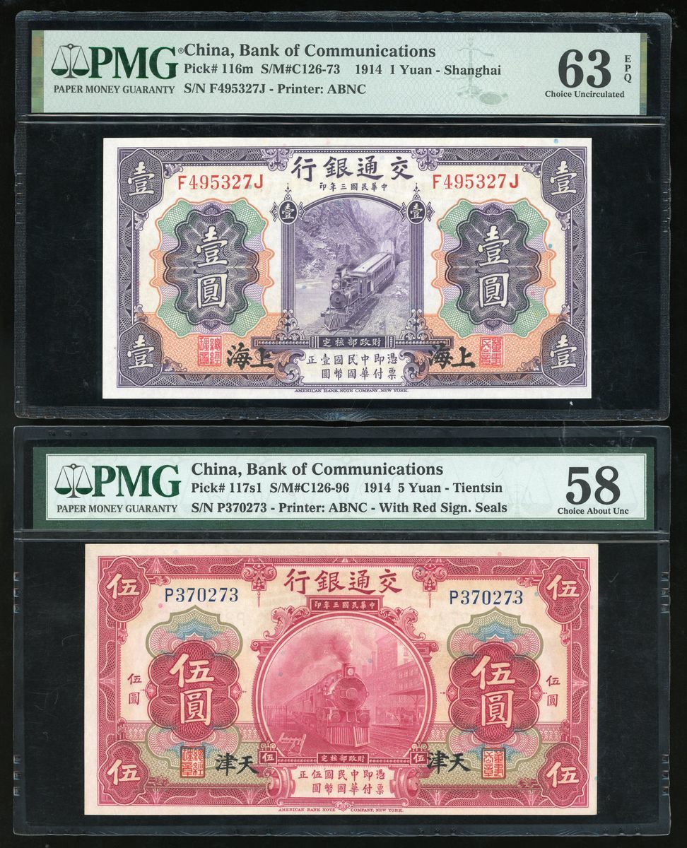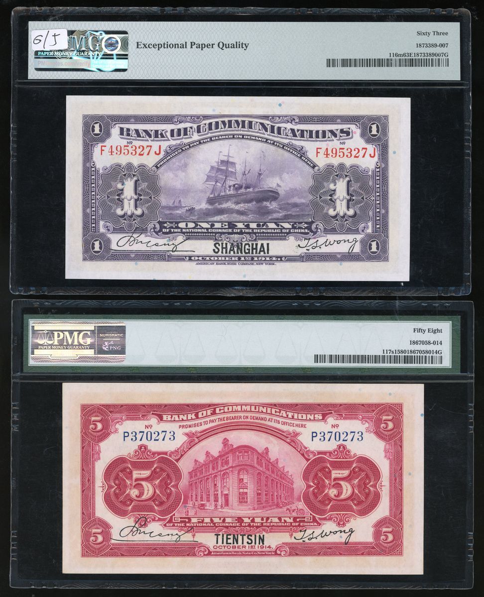 Bank of Communications, China, a pair, including, 1 yuan Shanghai and 5 yuan Tienstsin, (Pick 116m, 117s1) PMG 63EPQ and 58 respectively (2)