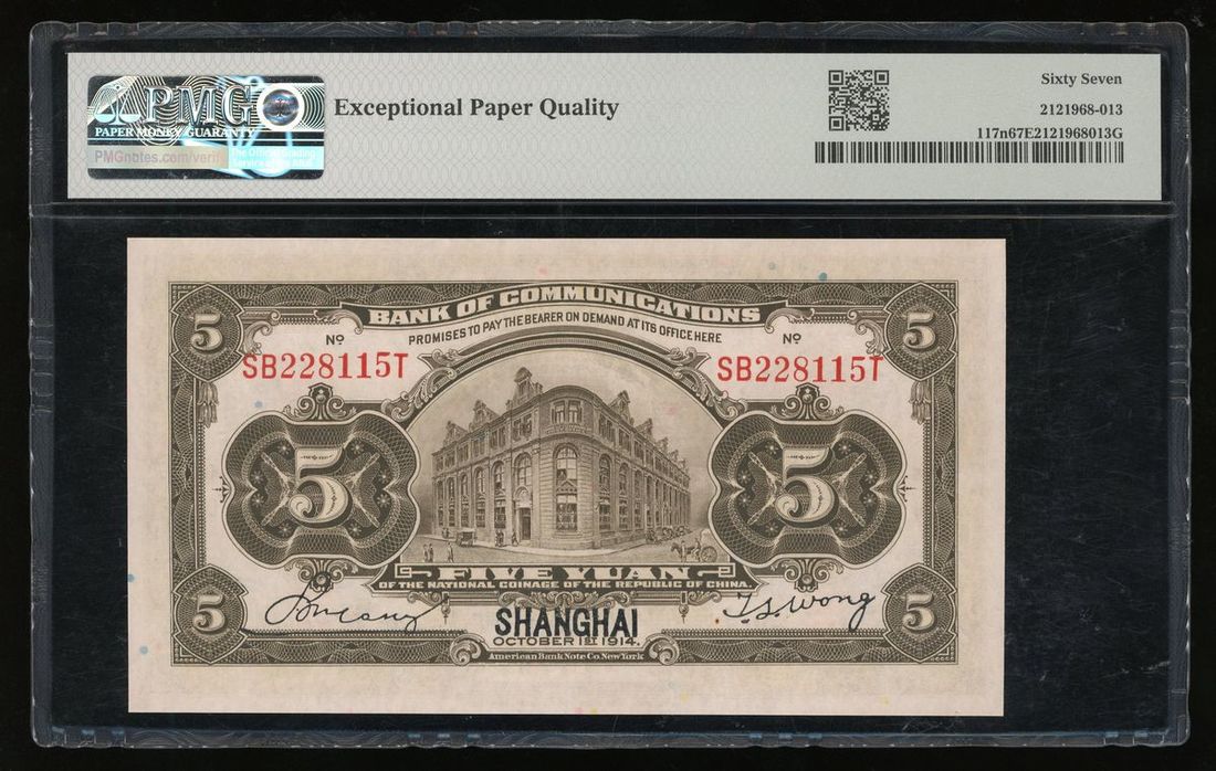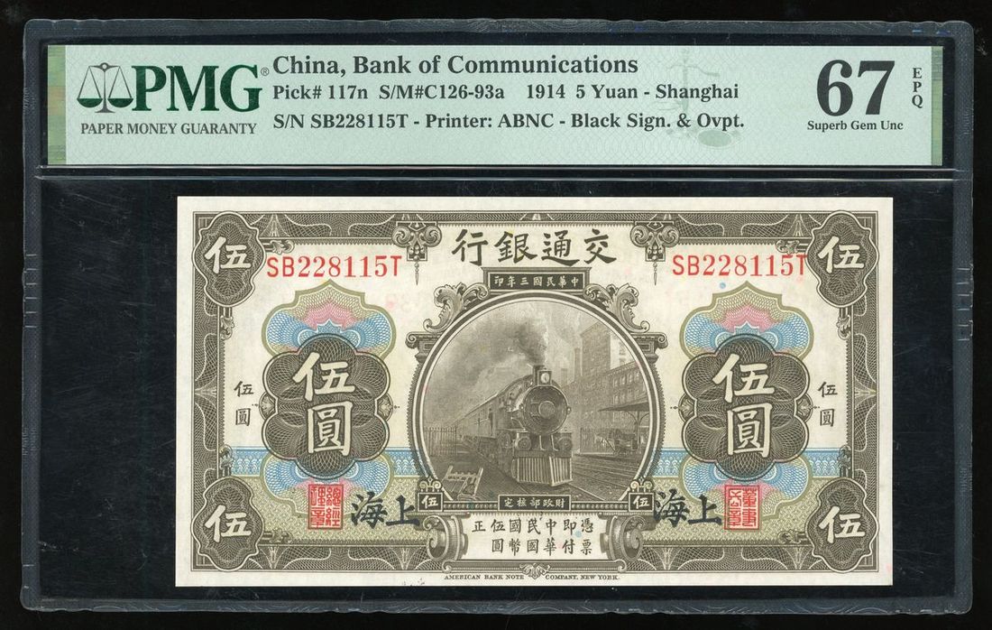 Bank of Communications, China, 5 yuan, Shanghai, Year 3 (1914), serial number SB228115T, (Pick 117n), PMG 67EPQ superb gem unc. Second highest grade with only 13 better