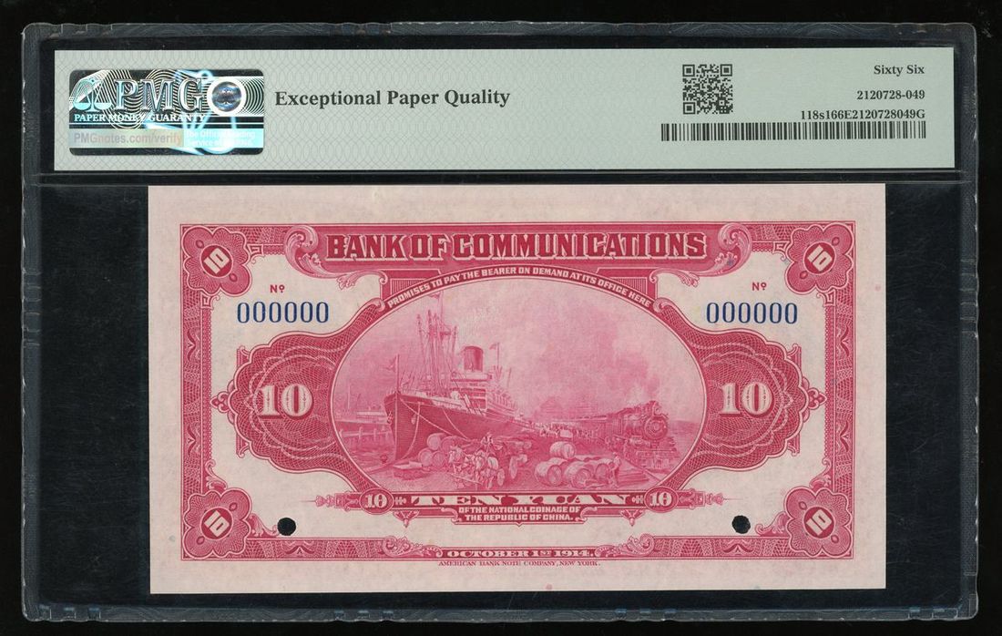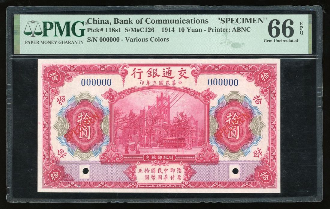 Bank of Communications, China, specimen 10 yuan, Year 3 (1914), zero serial numbers (Pick 118s1), PMG 66EPQ gem uncirculated