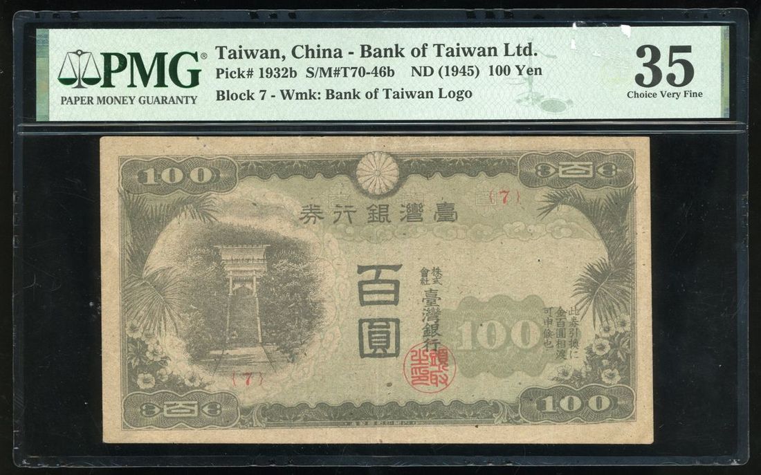 Bank of Taiwan, 100 yen, ND (1945), block 7, (Pick 1932b), PMG 35
