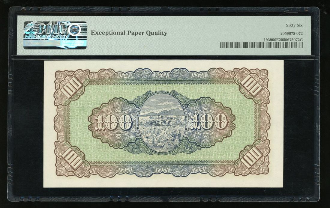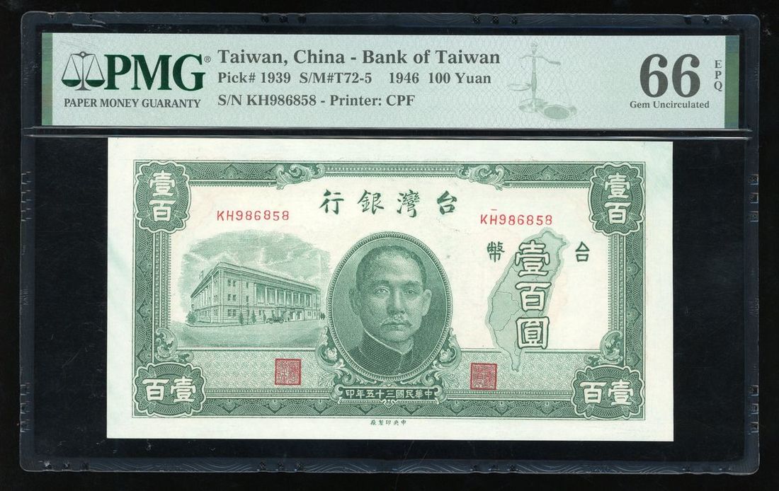 Bank of Taiwan, 100 yuan, Year 35 (1946), serial number KH986858, (Pick 1939), PMG 66EPQ
