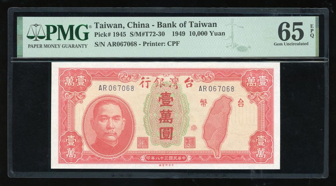 Bank of Taiwan, 10,000 yuan, Year 38 (1949), serial number AR067068, (Pick 1945), PMG 65EPQ