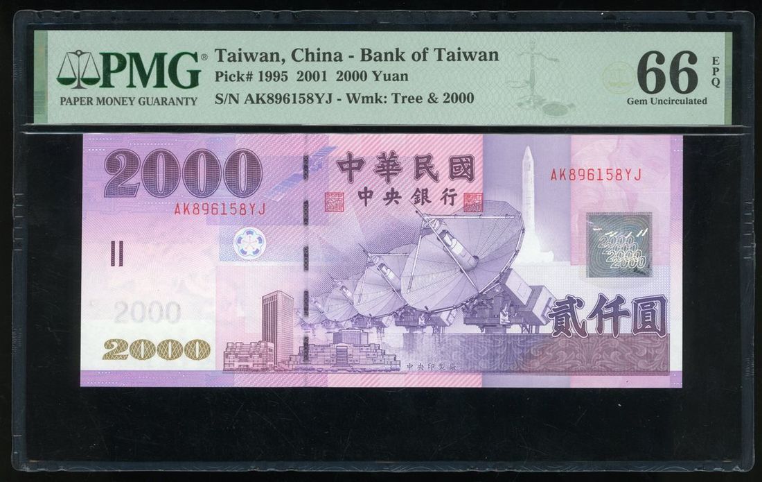 Bank of Taiwan, 2000 yuan, 2001, serial number AK 896158 YJ, (Pick 1995), graded PMG 66EPQ Gem Uncirculated