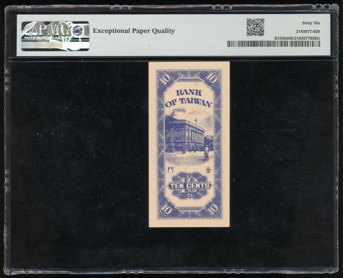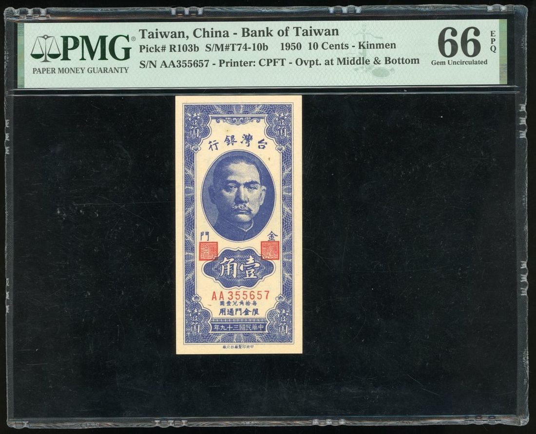 Bank of Taiwan, Kinmen Issue, 10 cents, Year 39 (1950), serial number AA 355657, (Pick R103b), PMG 66EPQ Gem Uncirculated, the 2nd highest grade and only 6 graded higher in the PMG population report