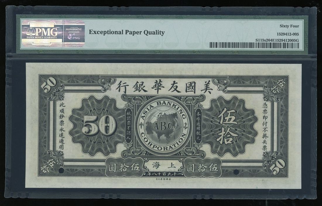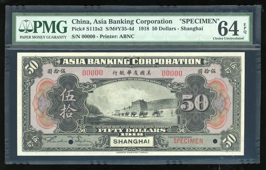 Asia Banking Corporation, China, specimen 50 yuan, Shanghai, 1918, serial number 00000, (Pick S115s2), PMG 64EPQ choice uncirculated. An original example