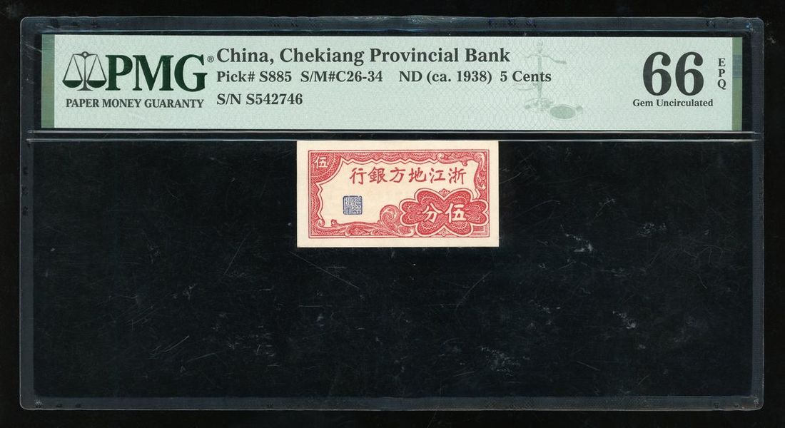 Cheikang Provincial Bank, China, 5 cents, ND (1938), serial number S542746, (Pick S885), PMG 66EPQ