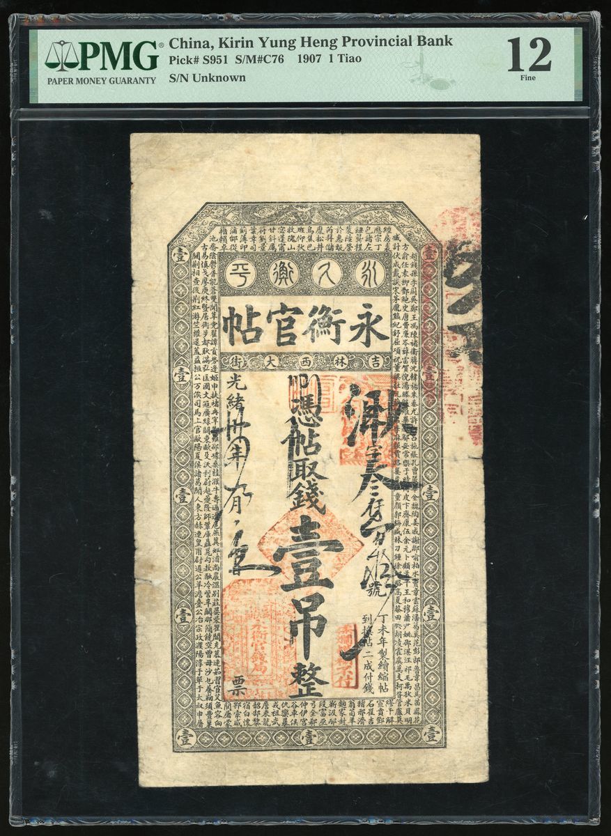 Kirin Yung Heng Provincial Bank, China, 1 tiao, Year 34 of Guangxu(1907), serial number unknown, vertical format, black text and brush writing, red seals,