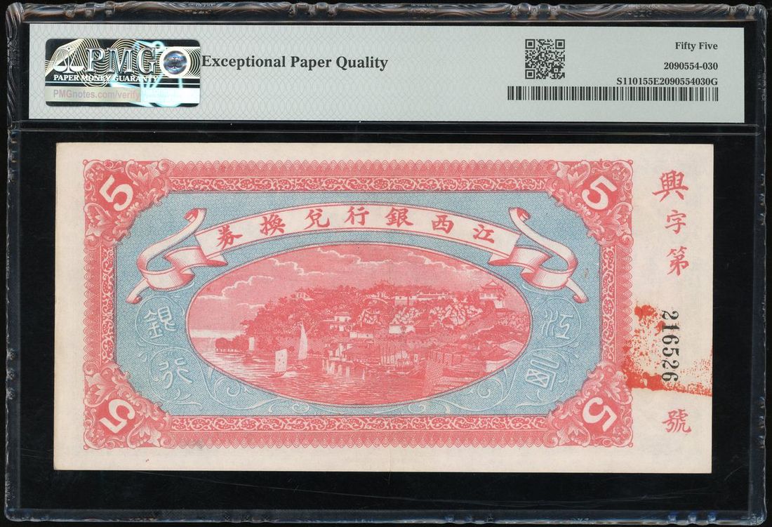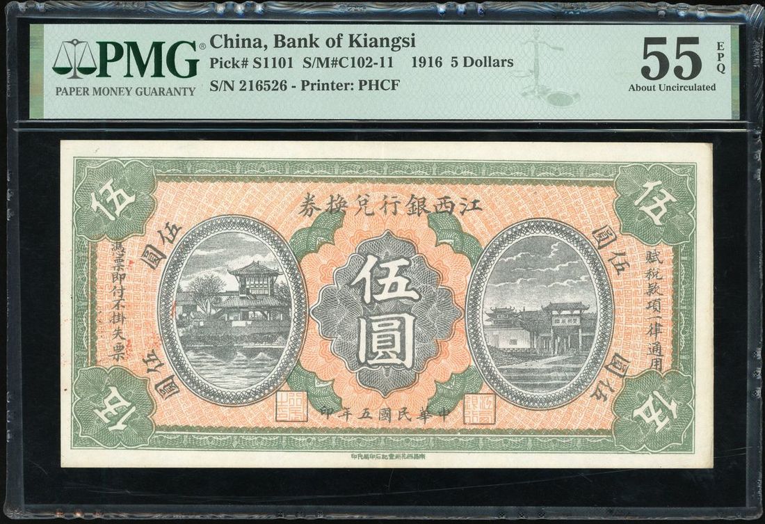 Bank of Kiangsi, China, 5 yuan, Year 5 (1916), serial number 216526, (Pick S1101), PMG 55EPQ. Quite scarce