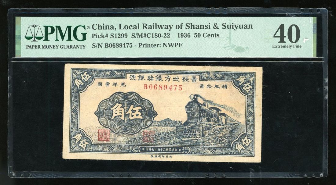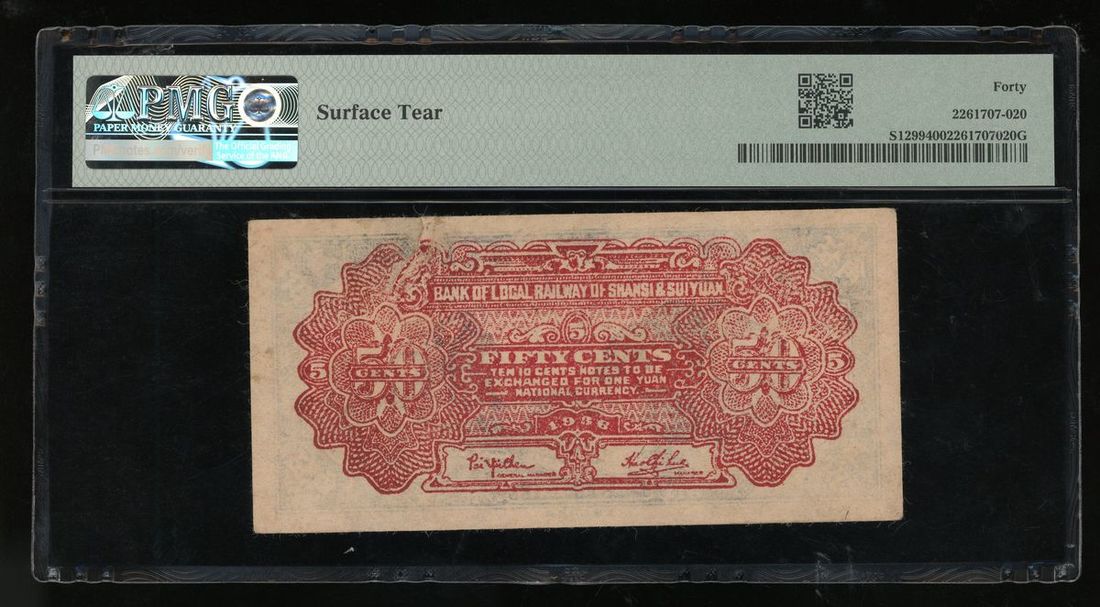 Local Railway of Shansi & Suiyuan, China, 50 cents, Year 25 (1936), serial number B0689475, (Pick S1299), PMG 40, surface tear.