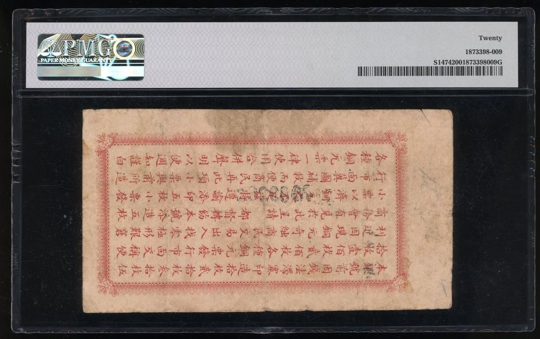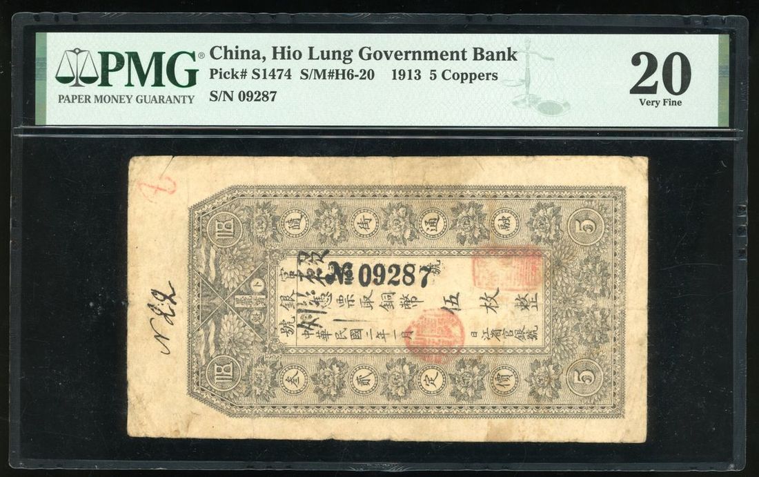 Hio Lung Government Bank, China, 5 coppers, Year 2 (1913), serial number 09287, (Pick S1474), PMG 20. Scarce early issue