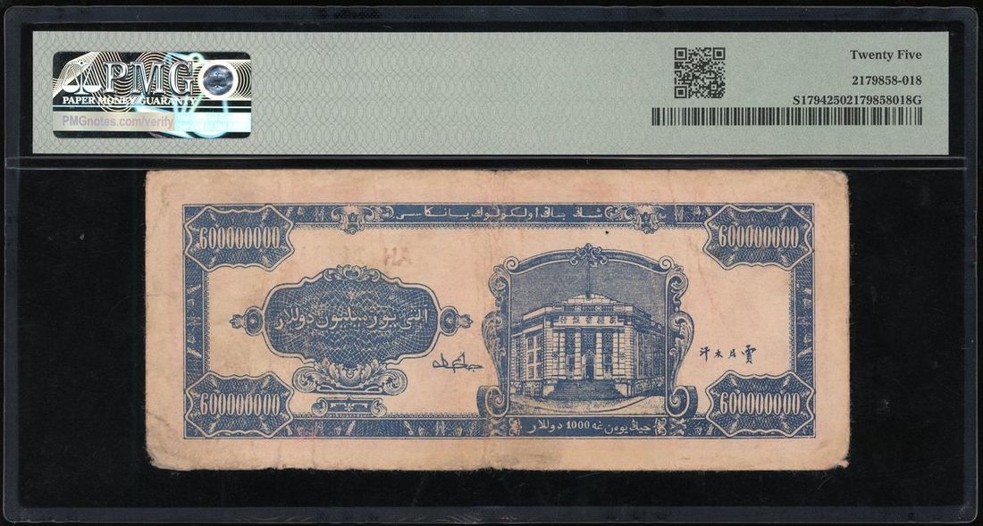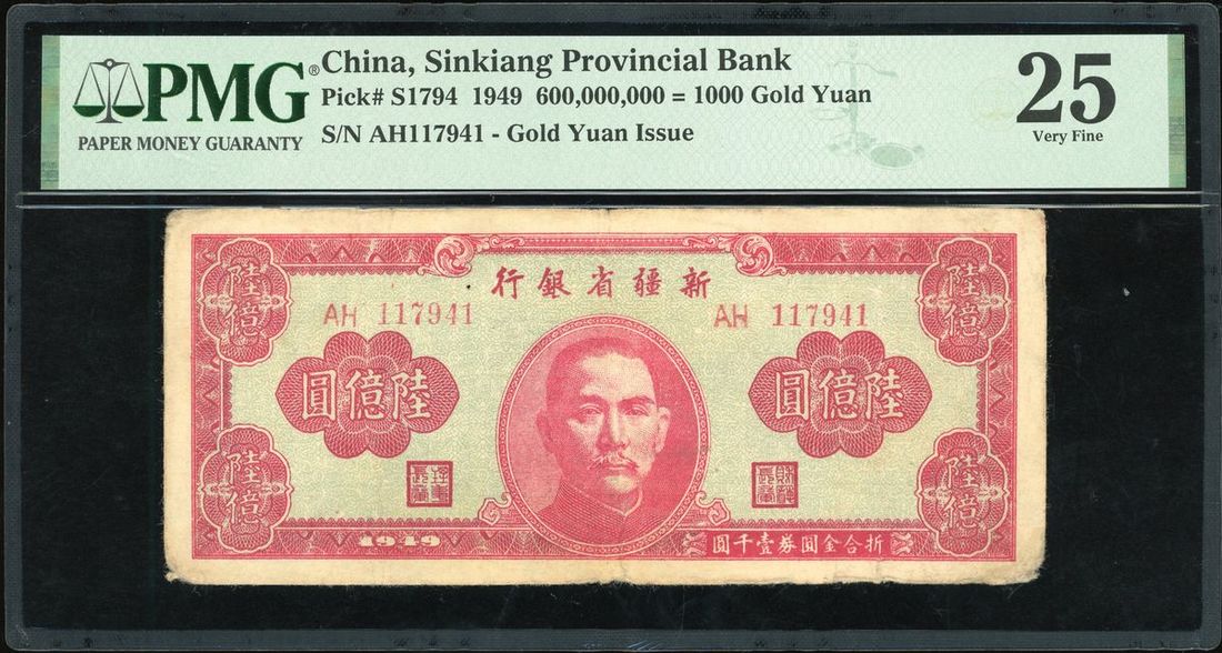 Sinkiang Provincial Bank, China, 60 million = 1000 gold yuan, 1949, serial number AH117941, (Pick S1794), PMG 25 very fine